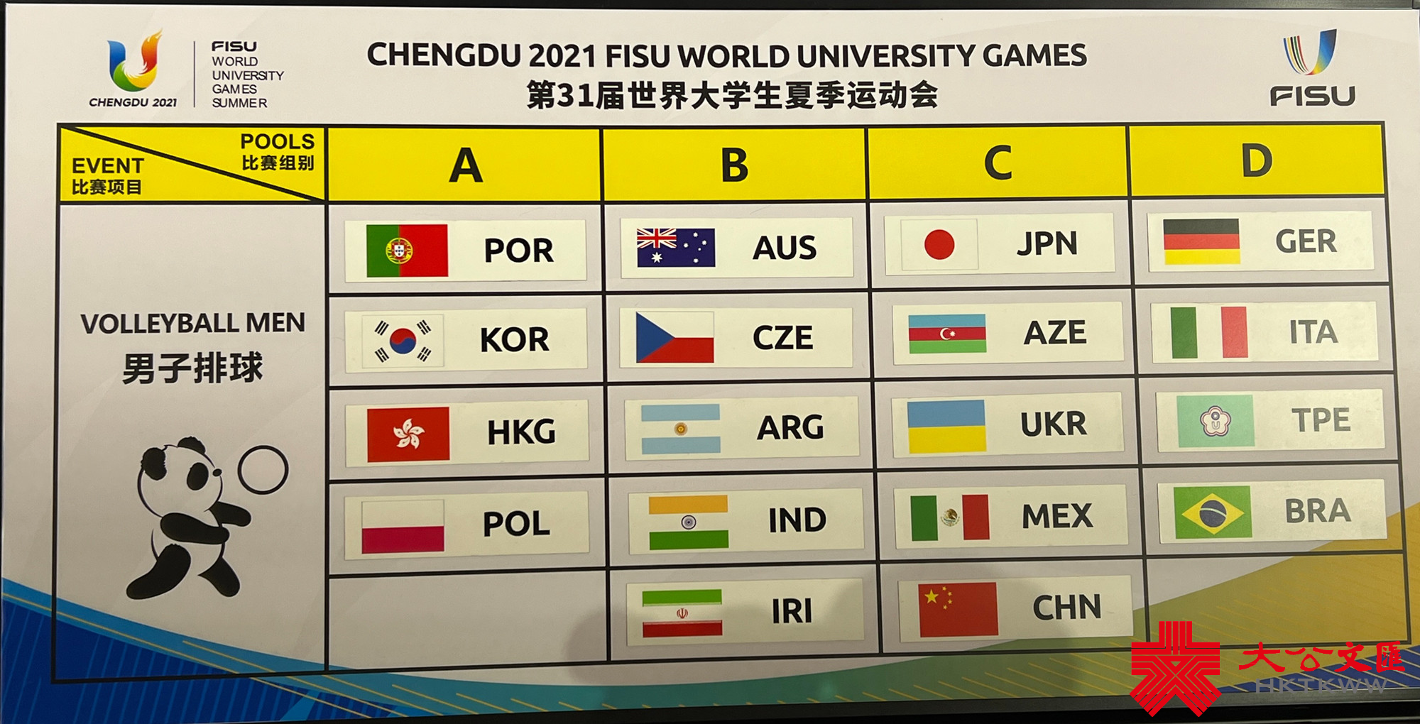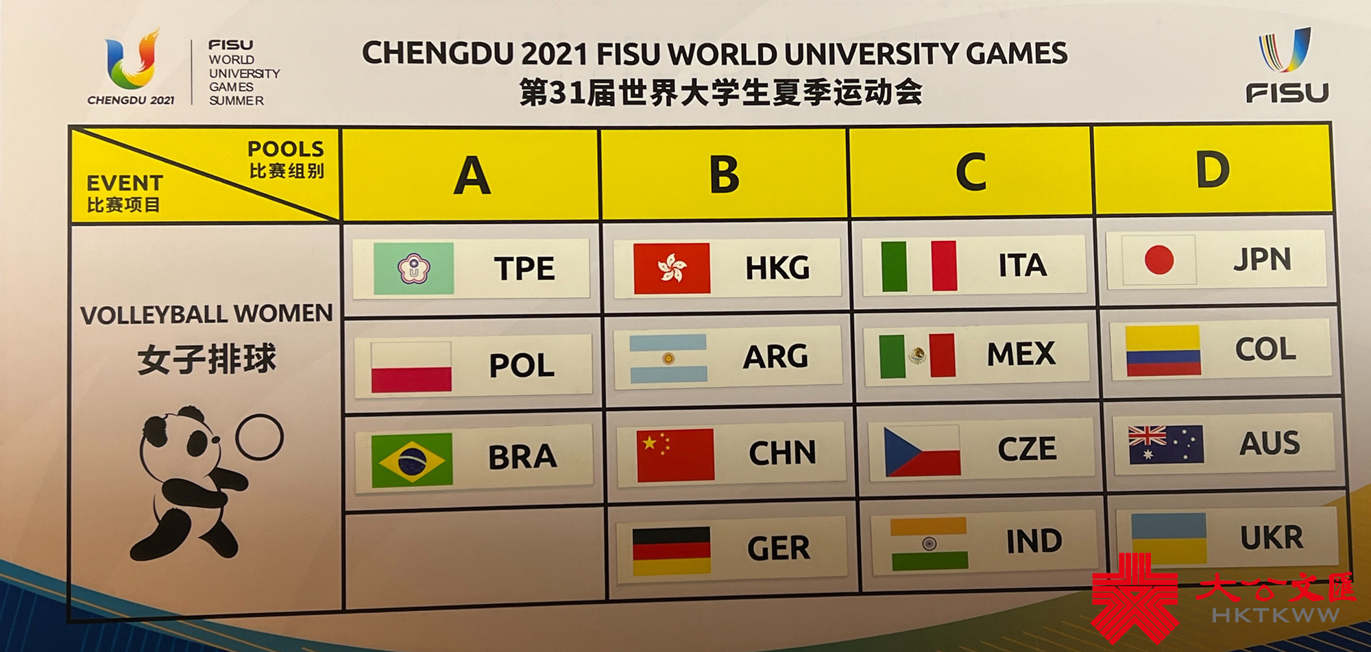 (大公文匯網記者 李兵)3月30日,國際大體聯在成都舉行第31屆世界大學生夏季運動會籃球、排球、水球三個團體項目的抽籤儀式,比賽對陣結果新鮮出爐。本屆大運會,中國香港代表團將參加「三大球」團體項目之一的排球比賽。其中,香港男排「落位」A組,將對陣葡萄牙、韓國、波蘭隊;香港女排「落位」B組,將對陣阿根廷、中國、德國隊。