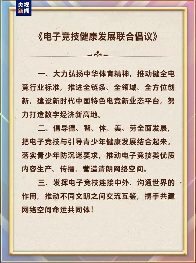 活動現場,中央廣播電視總台融合發展中心負責人與騰訊公司、嗶哩嗶哩、完美世界、英雄體育等企業代表發布《電子競技健康發展聯合倡議》,將共同推動健全電競行業標準,倡導德、智、體、美、勞全面發展,把電子競技與引導青少年健康發展結合起來,發揮連接中外、溝通世界的作用,攜手共建網絡空間命運共同體。
