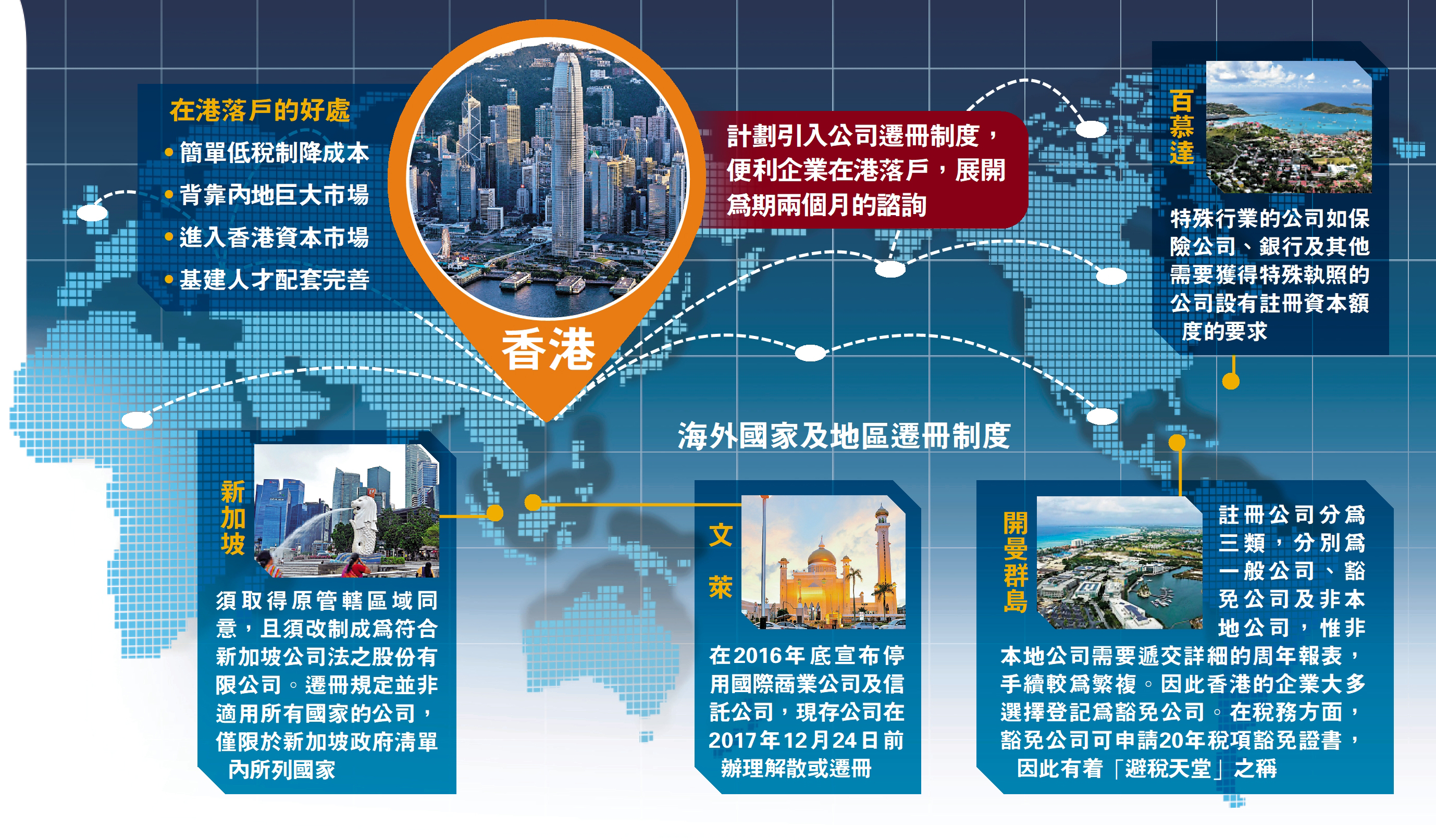 企業遷冊的原因,主要是新的註冊地有更佳的發展,同時稅務優惠、人才招聘等都對企業有利。此外,企業也要考慮法律因素,一般商業活動會在合約上訂明如有訴訟需按公司註冊地的法律來執行,若該註冊地的法律與交易方的國家或地區有重大法制分別,可能會影響其商業運作。