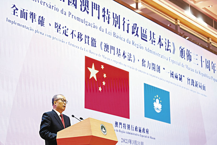 (香港文匯報記者 鄭治祖)紀念中華人民共和國澳門特別行政區基本法頒布三十周年大會昨日在澳門舉行。中共中央政治局委員、全國人大常委會副委員長李鴻忠出席並發表主旨講話。李鴻忠強調,中共二十大報告肯定和展現了多年來「一國兩制」實踐和港澳工作所取得的歷史性成就,同時提出了許多堅持和完善「一國兩制」的新理念和新要求,必須牢牢把握、始終遵循,作為開展港澳各方面工作的定海神針和行動指南。