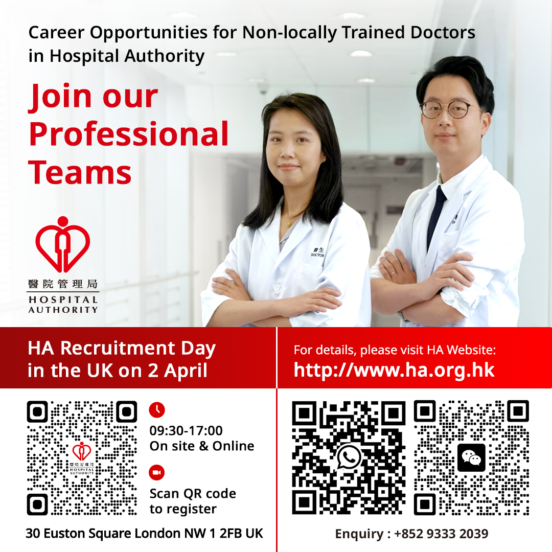 醫管局將於當地時間4月2日舉辦招聘日,表示歡迎所有醫科生、醫科實習生、受訓醫科生及專科醫生參加,並會在現場及線上為合資格參加者提供工作機會。