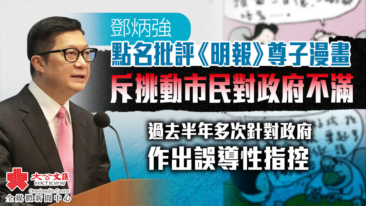 大公文匯全媒體報道,保安局局長鄧炳強今日(2日)出席活動後見傳媒時,點名批評《明報》「尊子漫畫」昨日(1日)刊登的漫畫是純粹誤導性的指控。鄧炳強重申,政府非常樂意接受批評,但是對於一些並非批評、並非基於事實的誤導性的指控,來挑動市民對政府的不滿,他認為有責任將真相說出來,公開對這些誤導性的指控作出譴責,並讓市民有知情權。