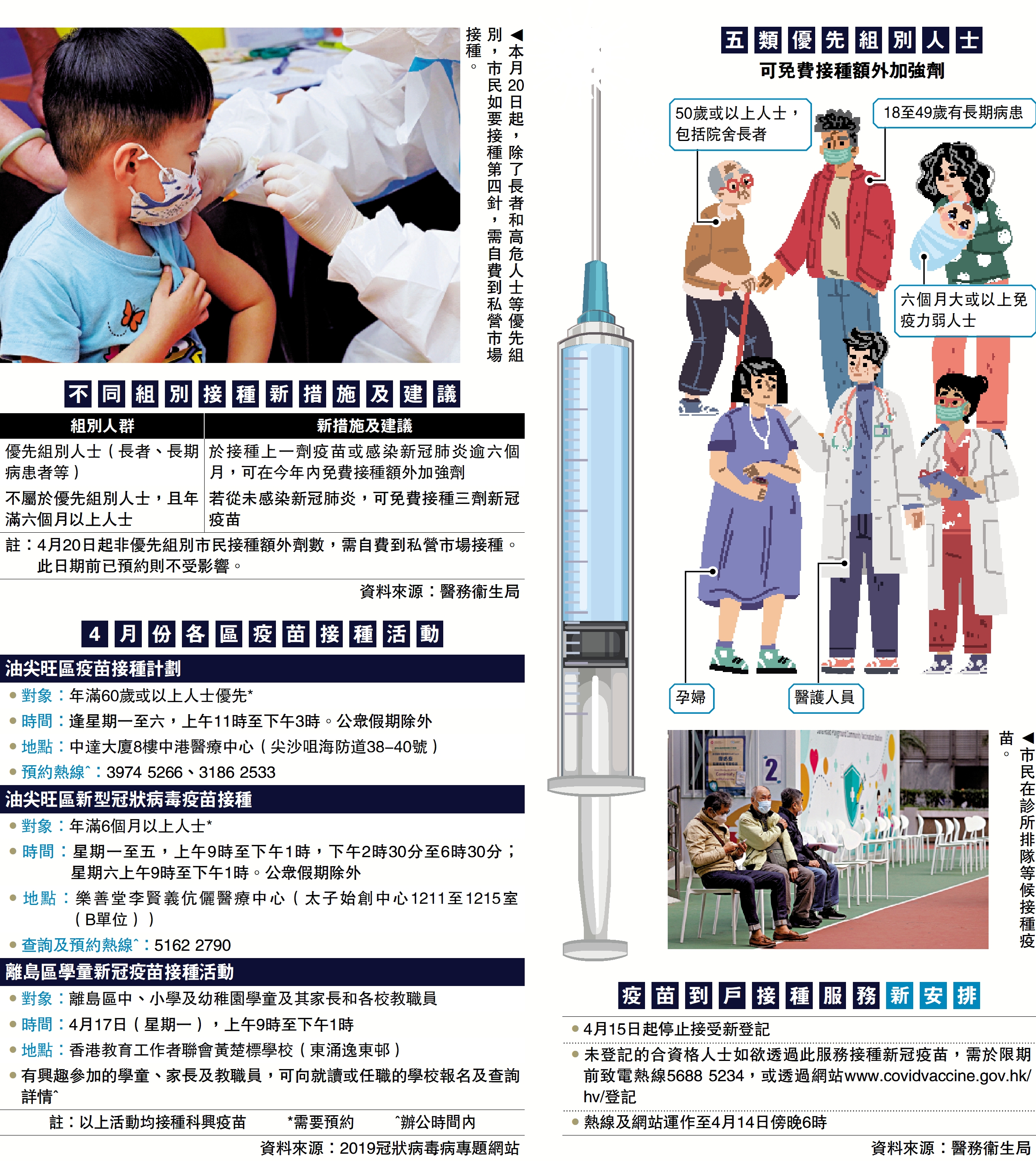 政府上周宣布新冠疫苗接種計劃最新安排,五類優先組別的市民(詳見表)不論過往已接種多少劑疫苗,在接種上一劑疫苗或感染新冠肺炎六個月後,今年內仍可免費接種額外的加強劑,合資格人士可由4月20日起在網上預約打針。