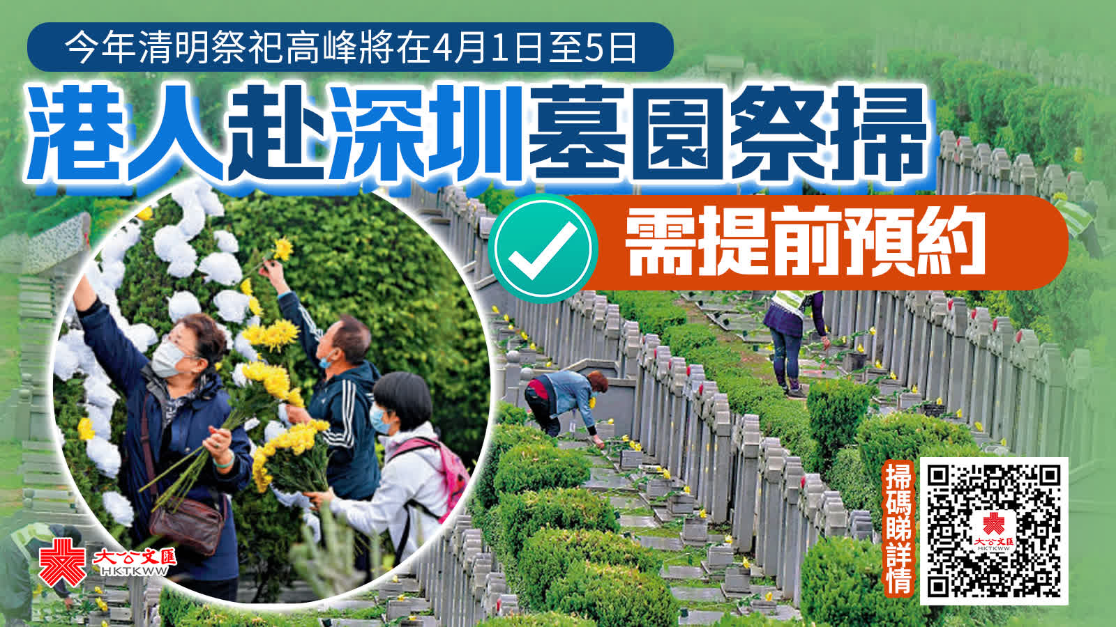(大公報記者 石華)受疫情影響,三年來,不少港人因防疫政策只能在網上或者請人代為掃墓。隨着深港兩地恢復全面通關,清明節將至,許多港人選擇回鄉祭祖、探親訪友。近日,記者從深圳市民政局獲悉,今年清明期間市民去墓園祭掃均需要提前預約,為方便老年人等特殊群體,在網上預約的同時也保留了電話預約、現場預約等方式,並設立了綠色便捷通道。為方便祭掃市民出行,有關交通部門也增設了三條祭掃接駁專線。
