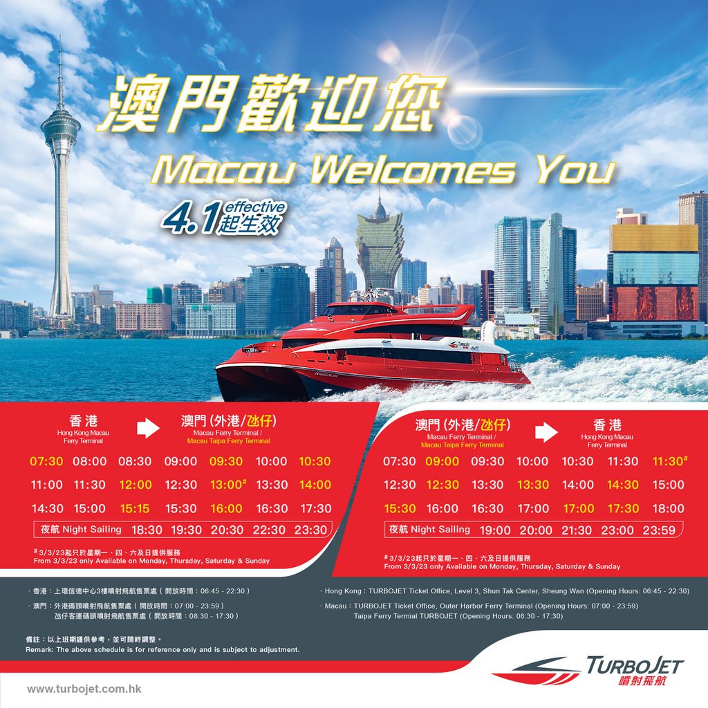 大公文匯全媒體報道,噴射飛航日前宣布,由4月1日開始,日、夜航船次共增加到52班,乘客無論在復活節長假期還是周末假期,都更容易安排船程往返澳門,讓享受假期的時間可以規劃得更好。