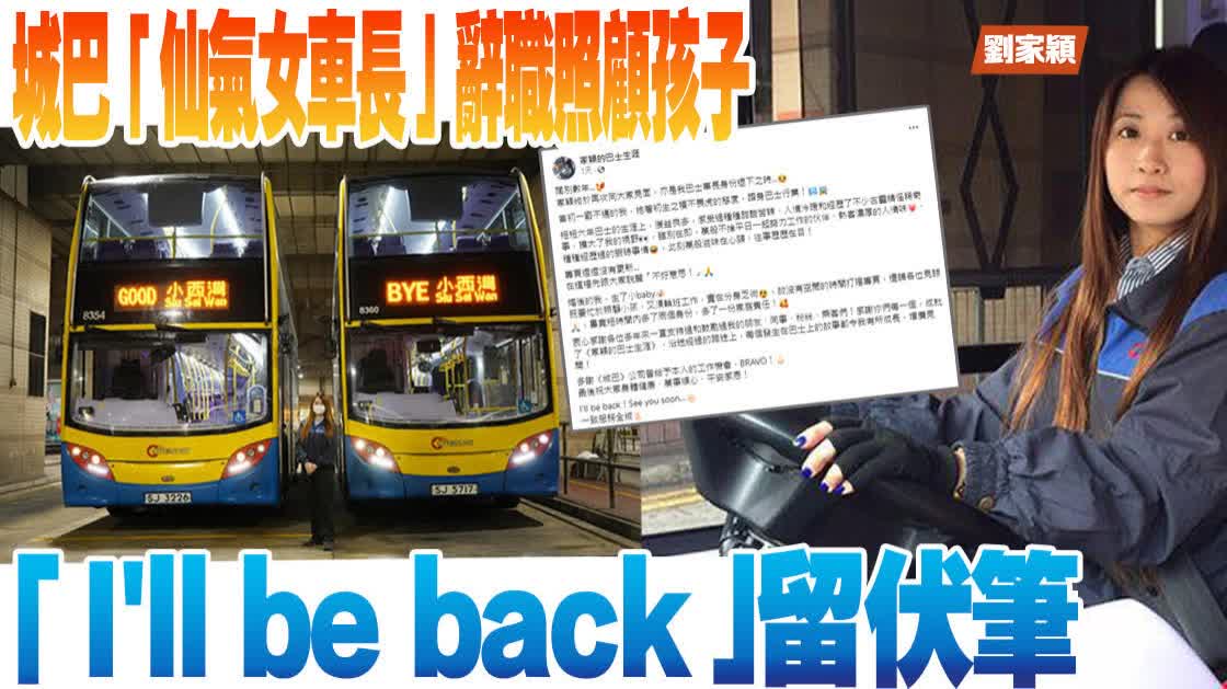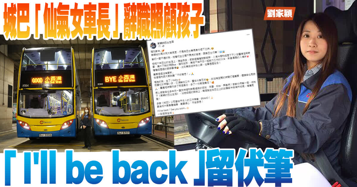 大公文匯全媒體報道,被封為城巴「仙氣女車長」的劉家穎,日前在社交平台宣布,為專心照顧孩子,決定退下巴士車長職務。大批網民和巴士迷紛紛留言為她打氣,並送上祝福,亦有網民大讚家穎堪稱「全港最受關注的女車長」,另有不少人懷念曾經有幸坐過她揸嘅巴士。
