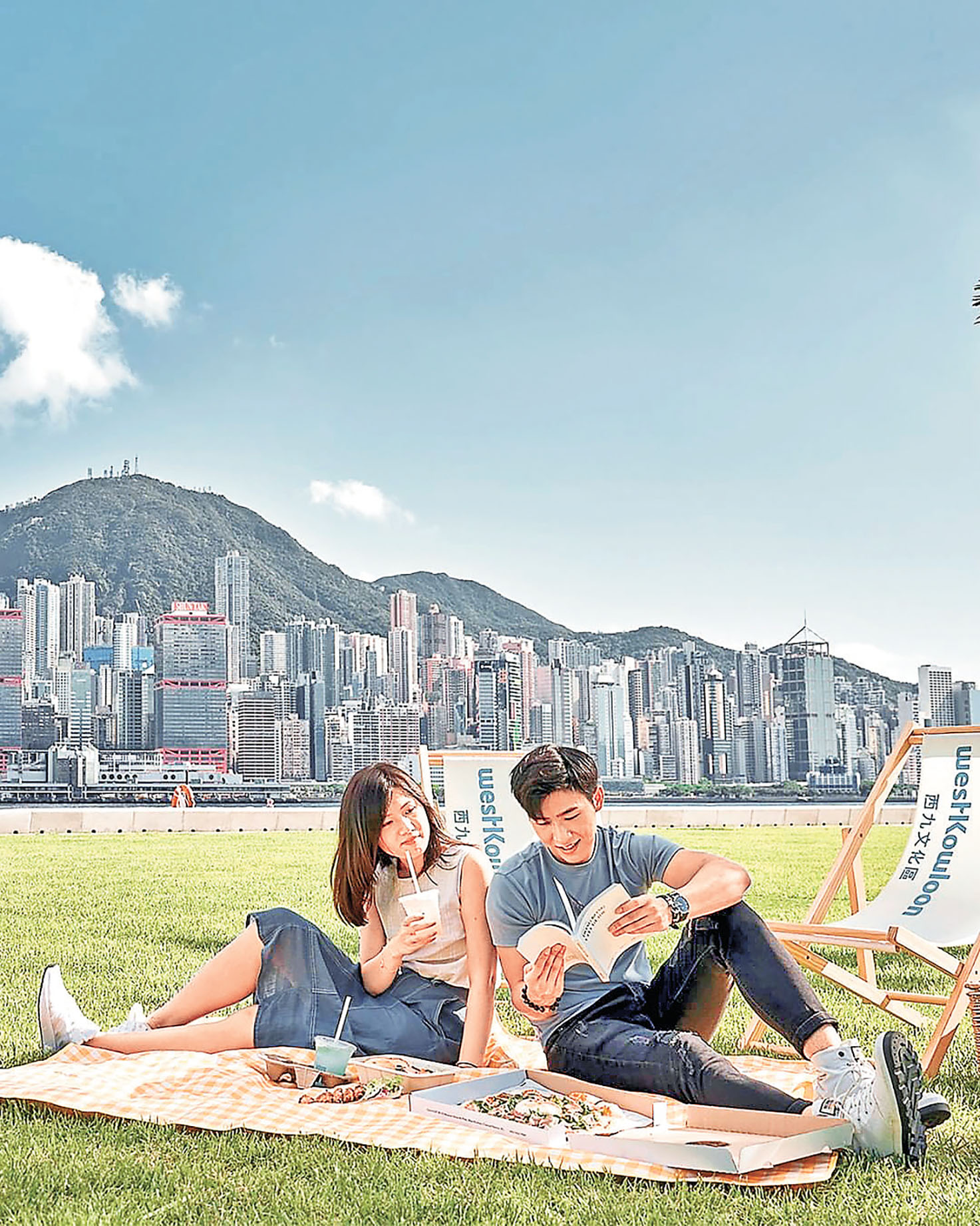是近來不少人的周末好去處之一,貪其環境悠閒寫意,亦是寵物友善區域,內有多項設施如藝術中心、M+展亭、單車徑等。不過,最受歡迎的一定是擁有無敵大海景的草坪,吸引了不少情侶來野餐。而大草地附近設有咖啡店和美食車等,非常方便。日落時,西九文化區的景色優美,絕對要打卡留念。