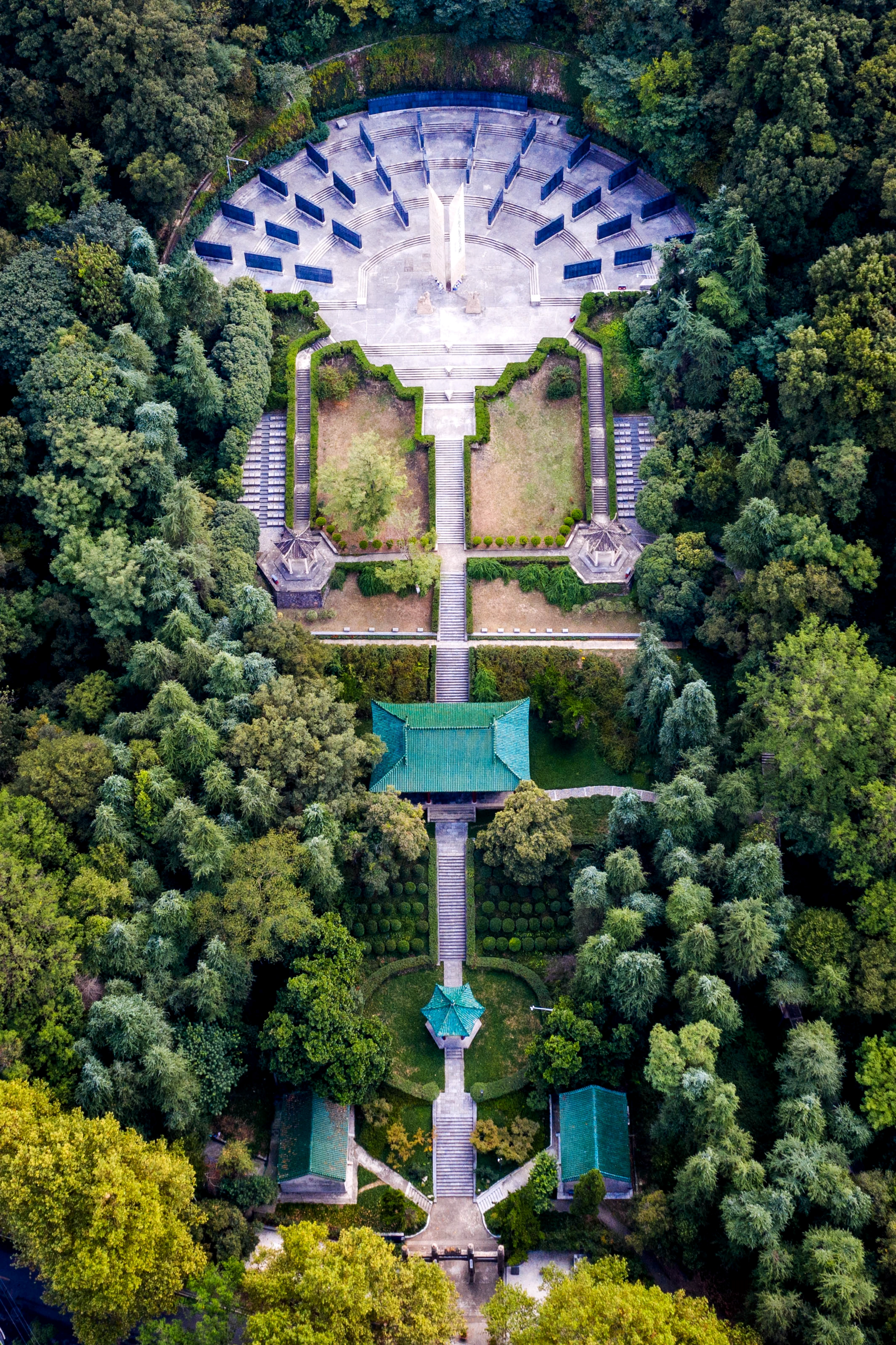 這張航拍照片上清晰地顯示出民國時期航空烈士公墓建成初期的布局。公墓整體造型呈警鐘形,鑲嵌在山坡上,牌坊前方一條土路橫貫東西,牌坊入口左右各有兩座耳房,一座帳篷式構築物往上居中有一個平台,平台左右和上方整齊排列着百餘座陣亡將士的墓穴。