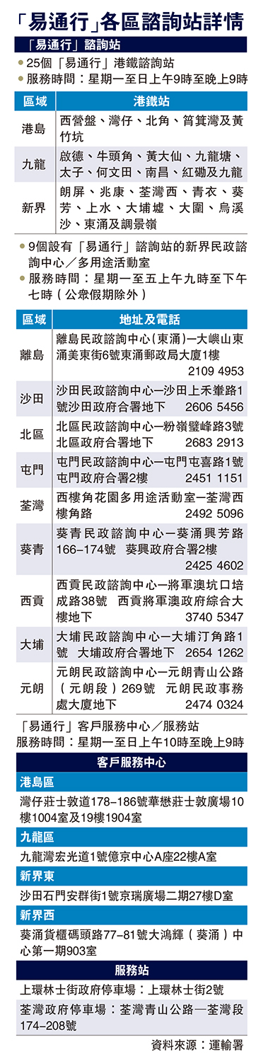 38%已取「車輛貼」的車主仍未完成登記程序,為方便他們辦理手續,位於上環林士街、荃灣政府停車場之的士專屬服務站,今日起開放予所有車主預約辦理申請,車主需先到易通行網站預約。34個位於港鐵站及新界民政事務處的諮詢站,繼續協助市民申請。截至前日,有關設施已分別處理超過3800宗的士申請及服務超過13800名市民。