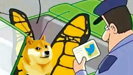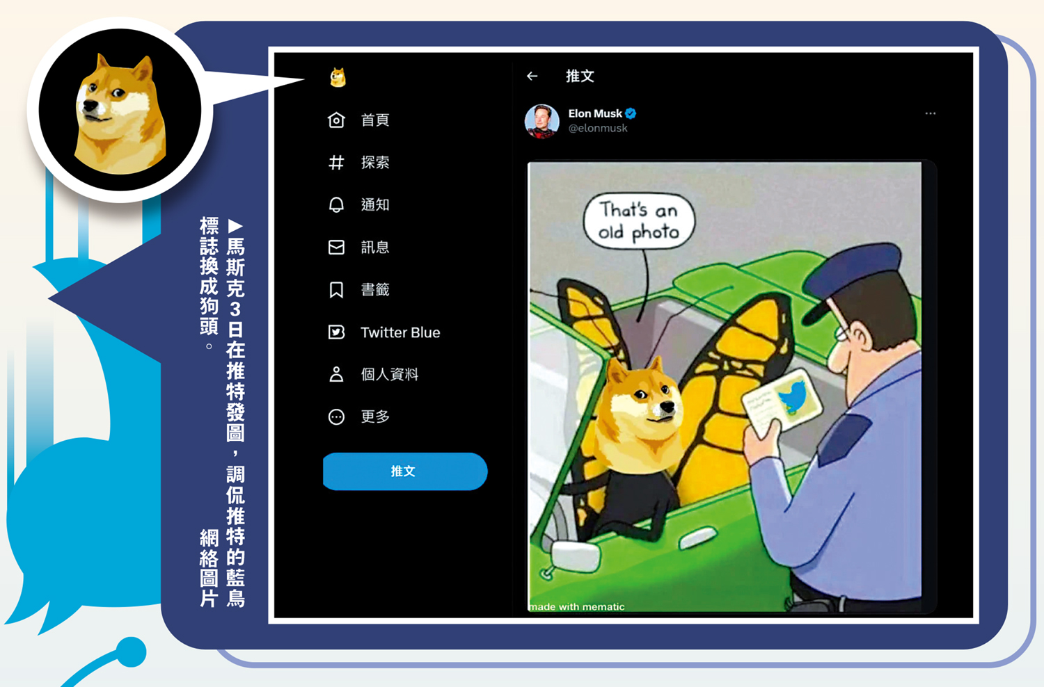 馬斯克在Twitter上分享了一張圖片,圖中顯示了一隻柴犬坐在車上,並對一位手中拿着藍色小鳥頭像證件的警察說,「那是一張舊照片」。馬斯克還發布了一張去年3月與網友的互動截圖,並說「正如我所承諾的那樣」。當時馬斯克問「是否需要一個新平台」,網友回覆說「買下推特然後把藍鳥標誌換成狗頭」,馬斯克回覆稱「哈哈,那太酷炫了」。