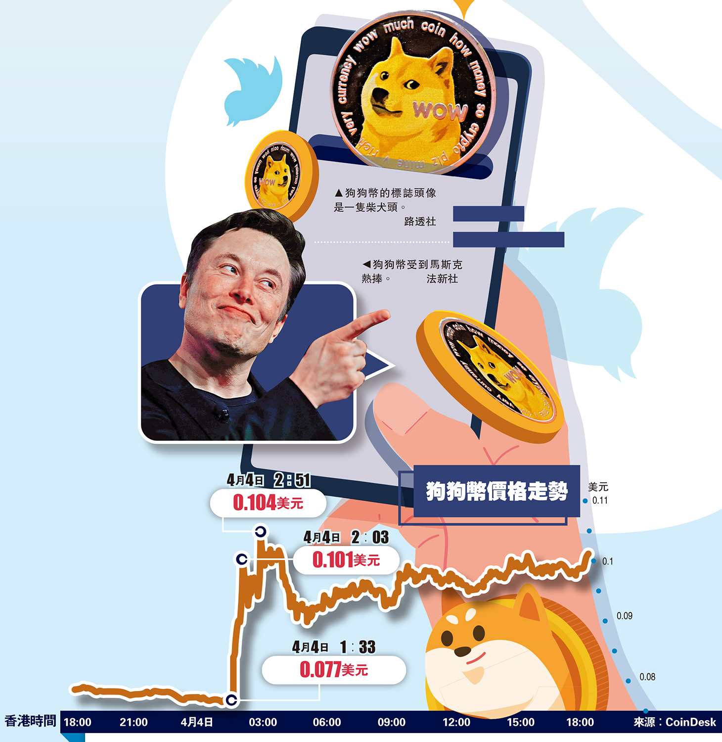 受Twitter更換標誌影響,加密貨幣狗狗幣的價格在當地時間3日飆升了30%以上,一度從0.077美元漲至0.102美元(約0.8港元),創去年12月以來盤中新高,最後稍微回落,4日報價為0.1美元。