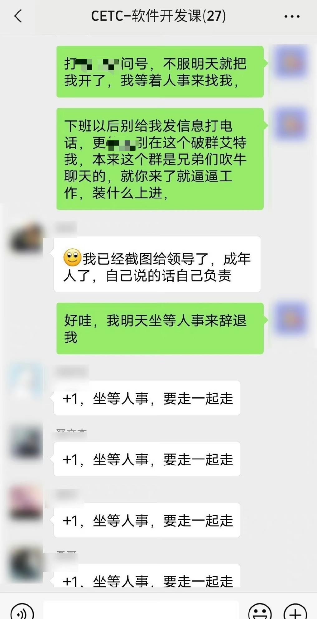 據聊天記錄,該領導對於員工的發言,回應「我已經截圖給領導了,成年人了,自己說的話自己負責」。陳某則回應指「坐等人事來辭退」。有關發言及事件引起部門同事的集體共鳴,紛紛要求辭職。
