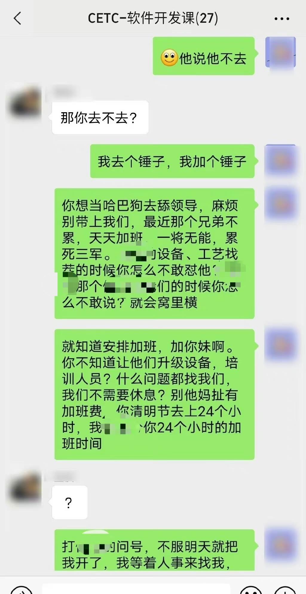 據網上流傳聊天截圖,事情起因是中國電科(CETC)成都區軟件開發事業部的領導,在清明節前的晚上要求員工「自願報名」紅假加班。該部門一名員工陳某,因部門長期加班嚴重及領導管理不當,兼被強制安排清明加班而暴怒,痛批領導「最近哪個兄弟不累,天天加班,一將無能,累死三軍」。