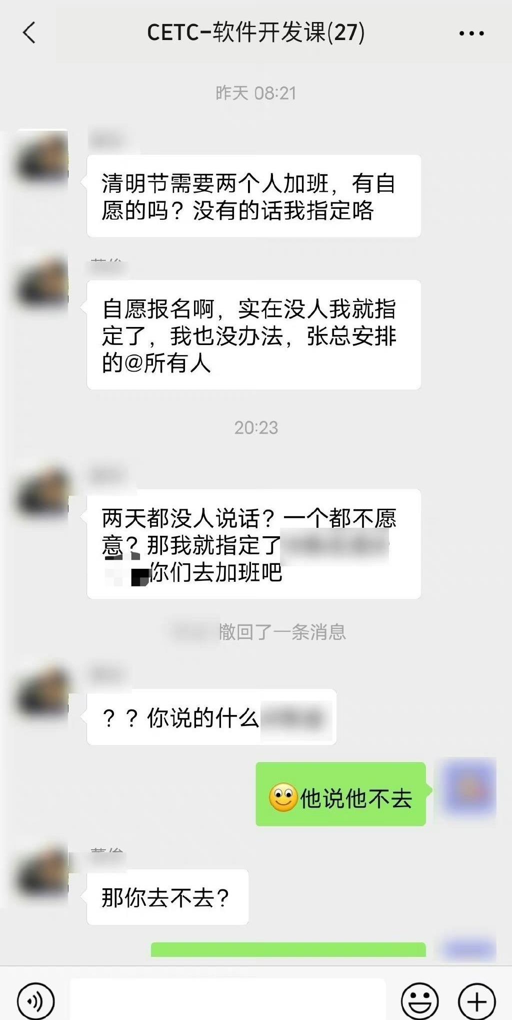 (大公文匯全媒體記者整理報道)昨日(4月4日),多條疑似央企中國電科員工因清明節強制加班怒懟領導的聊天記錄在網上傳播。內地網民對事件高度關注,有關話題今日(5日)多次登上微博熱搜榜單首位。