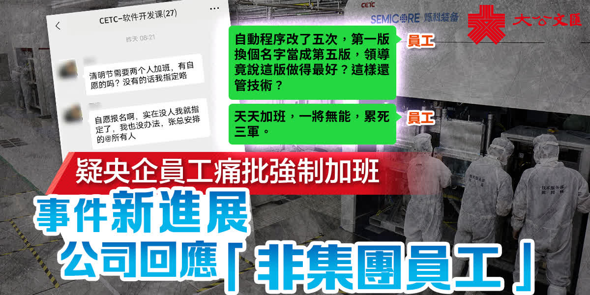 大公文匯全媒體報道,多條疑似央企中國電科員工因清明節強制加班「怒批」領導的聊天記錄昨日(4日)起在網上傳播,內地網民對事件十分關注,有關話題多次登上微博熱搜榜單首位。該事件目前有了新進展,疑似當事人陈某今日回應媒體稱自己已經離職,相關企業亦發聲表示網傳內容所涉单位非集团公司所属成员单位和员工。