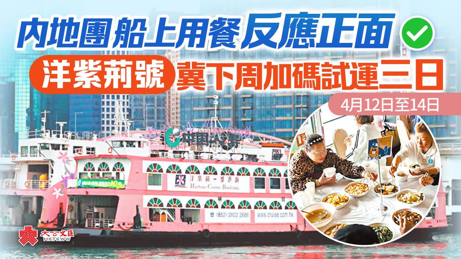 大公文匯全媒體報道,兩地全面通關後,不少內地旅遊團來港旅遊,九龍城區出現人流車流嚴重阻塞的現象,業界承諾實施改善措施,昨日(5日)有內地團轉到海上用餐,團友可一邊午膳一邊欣賞維港景色。有份接待的「洋紫荊維港遊」號營運總監葉定國今日(6日)在一個電台節目中表示,公司昨日只安排一輪午膳,初步知道旅客食得好開心,對維港遊行程反應正面,目前正與旅行社商討,希望安排下周三至周五(12日至14日),再試行海上用餐。
