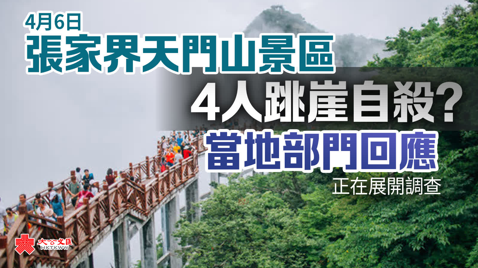 據內地媒體報道,4月6日一份網絡文件稱,4名遊客(3男1女)於4日在天門山景區山頂西線玻璃棧道上翻越安全護欄跳崖,其中3人跳下,1人被及時阻止後緊急送醫,但因其跳崖前已經服毒,經搶救無效死亡。該文件顯示的報送單位為張家界市永定區人民政府,接收單位為張家界市政府總值班室。