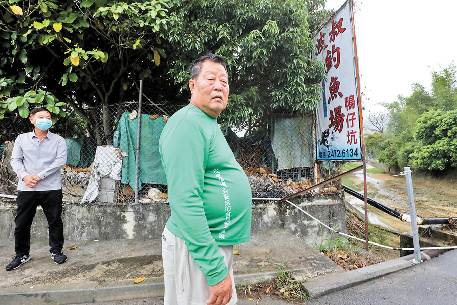 與波叔同病相憐的,還有在下白泥住了50年的釣魚場老闆健哥。為治水患,他年前已將魚塘壆加高,惜無補於事。他憶述年前颱風天鴿襲港,暴雨湧上路面,大水湧入魚塘,8萬呎魚塘變成黃泥水一片,「啲魚沖走晒,損失20幾萬元,好慘!」