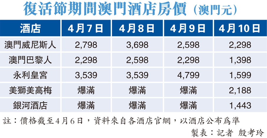 復常後首個長假期,大批旅客湧到澳門旅遊,復活節期間(4月7日至10日)澳門酒店房價被搶貴,有傳個別酒店更索價6,000元一晚。翻查部分澳門熱門酒店的官方網頁顯示,雖然仍有房間可供預訂,但房價較平日明顯上升。以永利皇宮為例4月7日至10日,以9日(星期日)晚的房最貴,達4,799澳門元,7日至8日(星期五及六)的房價每晚亦需要3,539澳門元,但10日(星期一)的房價已回落到1,398澳門元。另外,美獅美高梅和銀河酒店於復活節假期首3日的房間已預約爆滿。