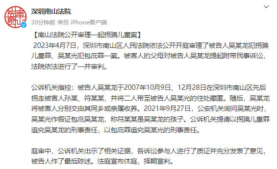 據深圳市南山法院微博消息,4月7日,深圳市南山區人民法院依法公開開庭審理了被告人吳某龍犯拐騙兒童罪、吳某光犯包庇罪一案。被害人的父母對被告人吳某龍提起附帶民事訴訟,法院依法進行了一併審判。