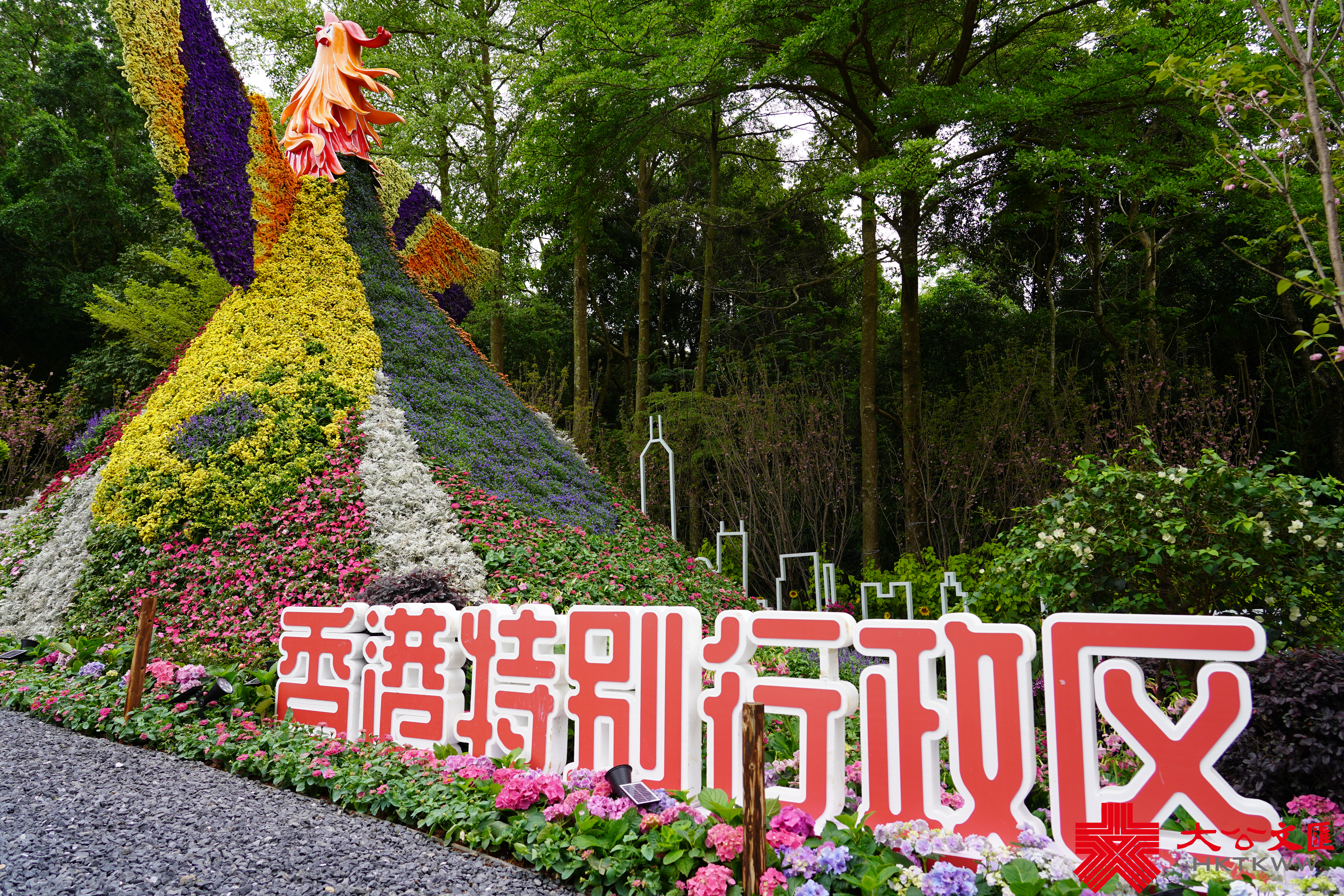 據介紹,香港園名為「再上征途」,依靠祖國鼎力支持,全國人民與香港市民風雨同舟,才讓香港走出三年疫情。設計的主要視點是利用鳳凰造型的立體花壇,配以維港兩岸的城市形象剪影,象徵香港猶如鳳凰振翅,蓄勢待發,騰飛四海。鳳凰以重生能力著稱,同時寓意吉祥和諧,並帶來新希望。園內遍植杜鵑花,絢麗繽紛,正好代表香港多姿多彩的生活方式。香港背靠祖國,面向國際,前景美好,最宜在此追尋夢想。