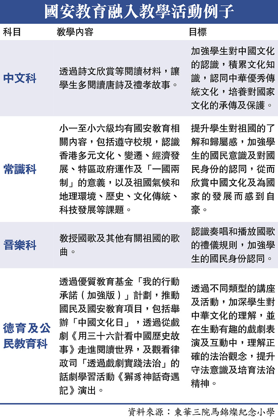她介紹,學校老師構思相關教學活動時,會在不同範疇思考,透過整體規劃,整合各科課時內外的課堂和活動,將國家安全與日常生活緊扣,例如中文科可讓學生多閱讀唐詩及禮孝故事,常識科藉了解祖國氣候和地理環境等,建立對國家的歸屬感(見表)。