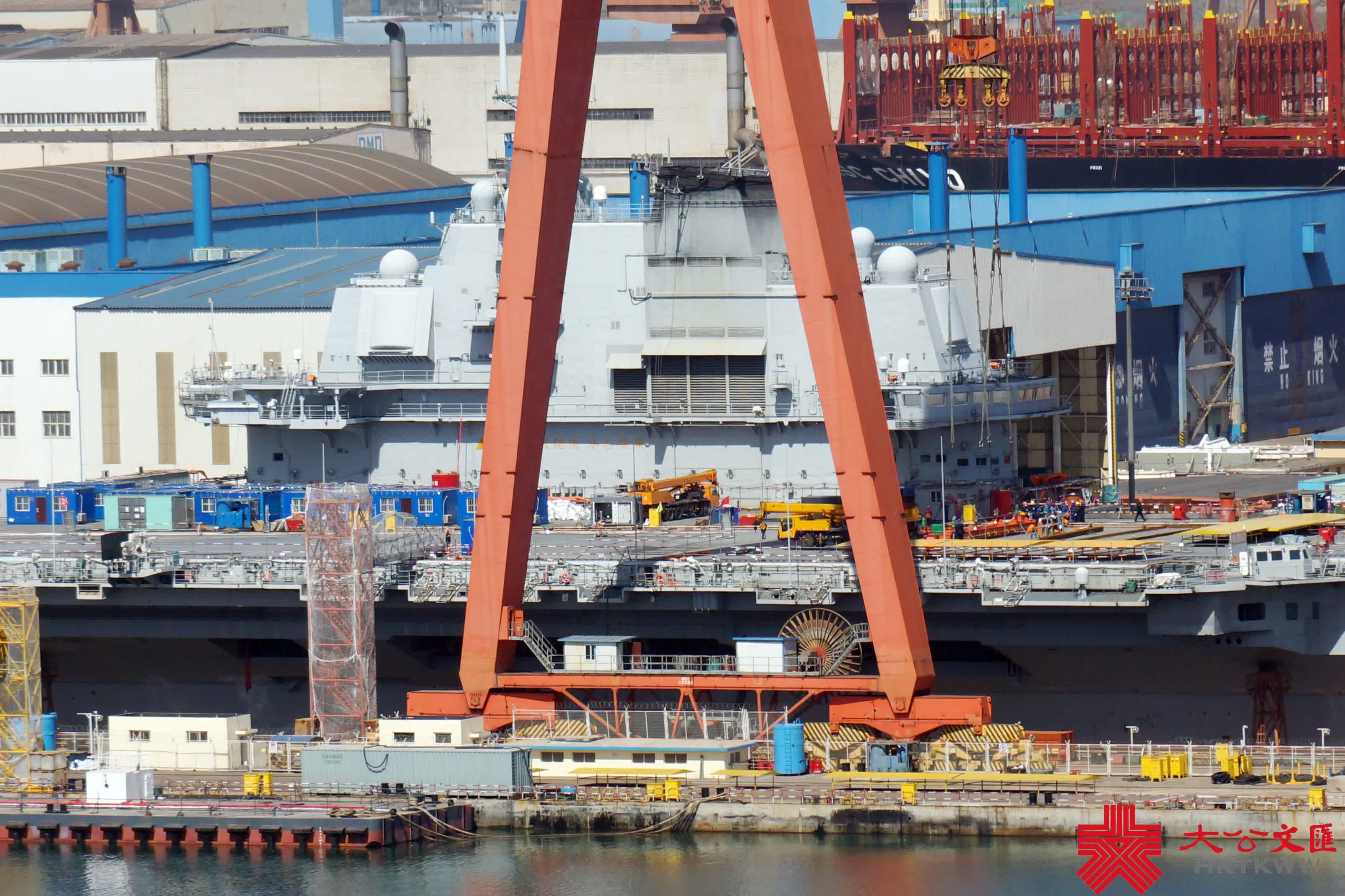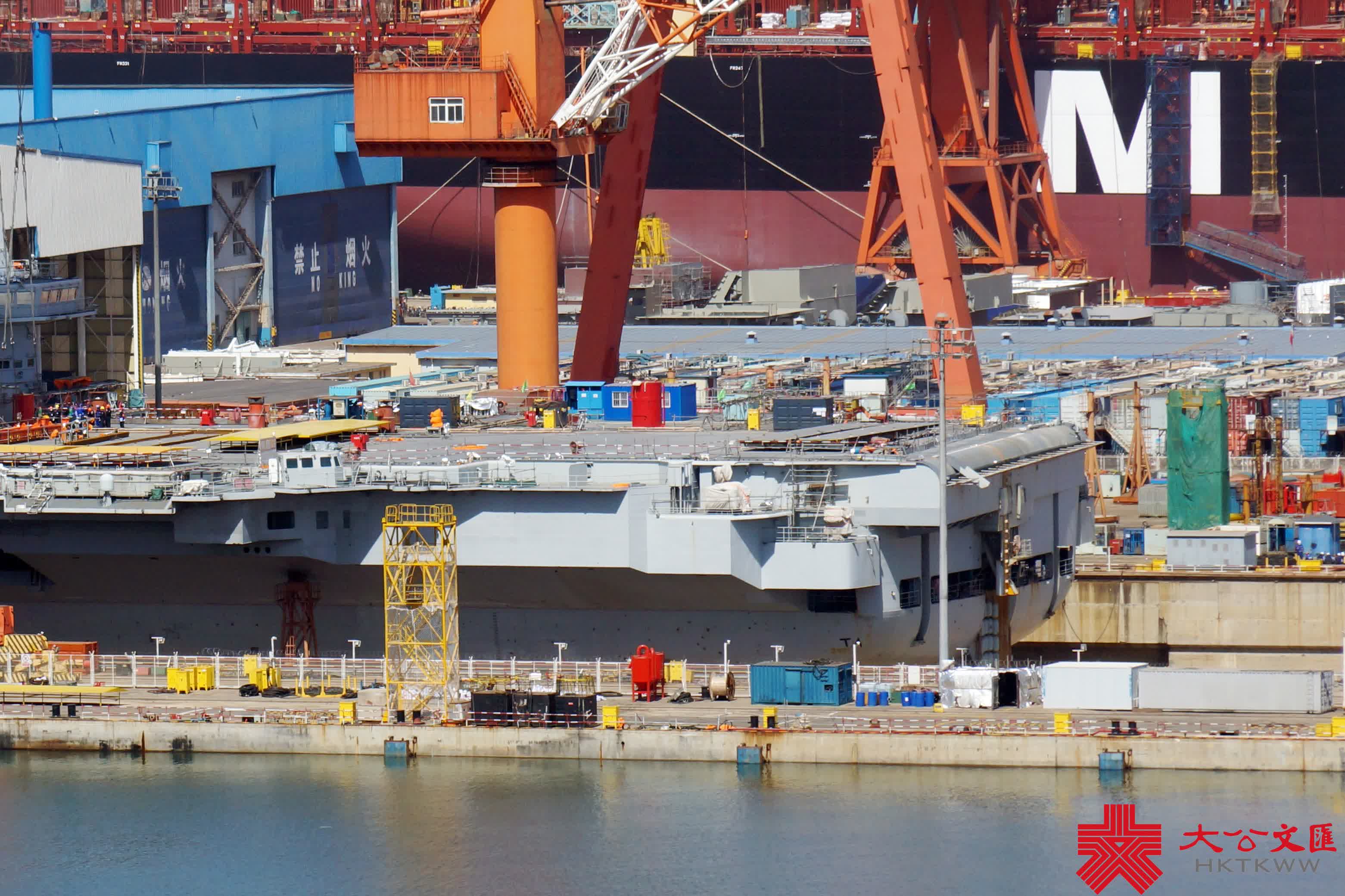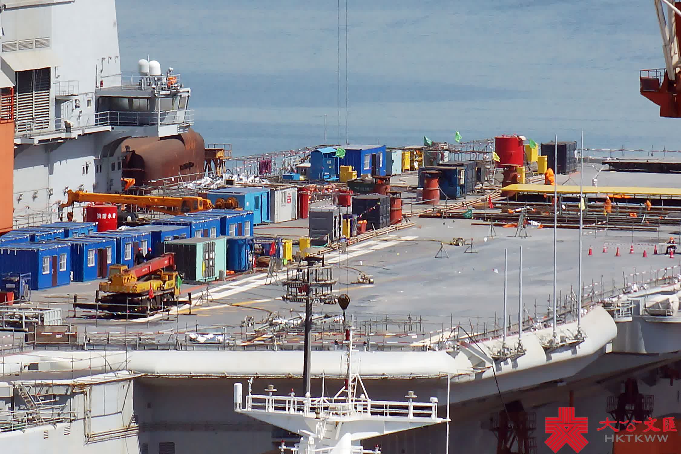 (大公文匯網記者 宋偉)在4·23海軍節即將來臨之際,中國首艘航母遼寧艦返廠維護也迎來施工高峰期。今年2月28日,遼寧艦按計劃返回大連造船廠維護,並於3月底入船塢,施工至今已月餘。目前,航母甲板密布重型機械及設備艙箱,阻攔索及周邊正在展開維護作業,甲板標示線亦被打磨清除,料將重鋪塗層。
