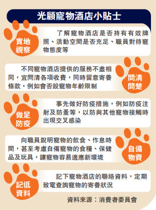 市面上的寵物酒店,通常提供不同房型的選擇,房間愈小,收費通常愈平。消委會提醒,寵主宜了解除收取住宿費外,會否對沖涼、餵食、散步等活動進行額外收費。另外,並非所有寵物酒店都提供接送,且不同地區的接送收費亦不同;寵物酒店通常提供免費的拍照及傳送給主人的服務,但可能會限制次數或相片傳送途徑。