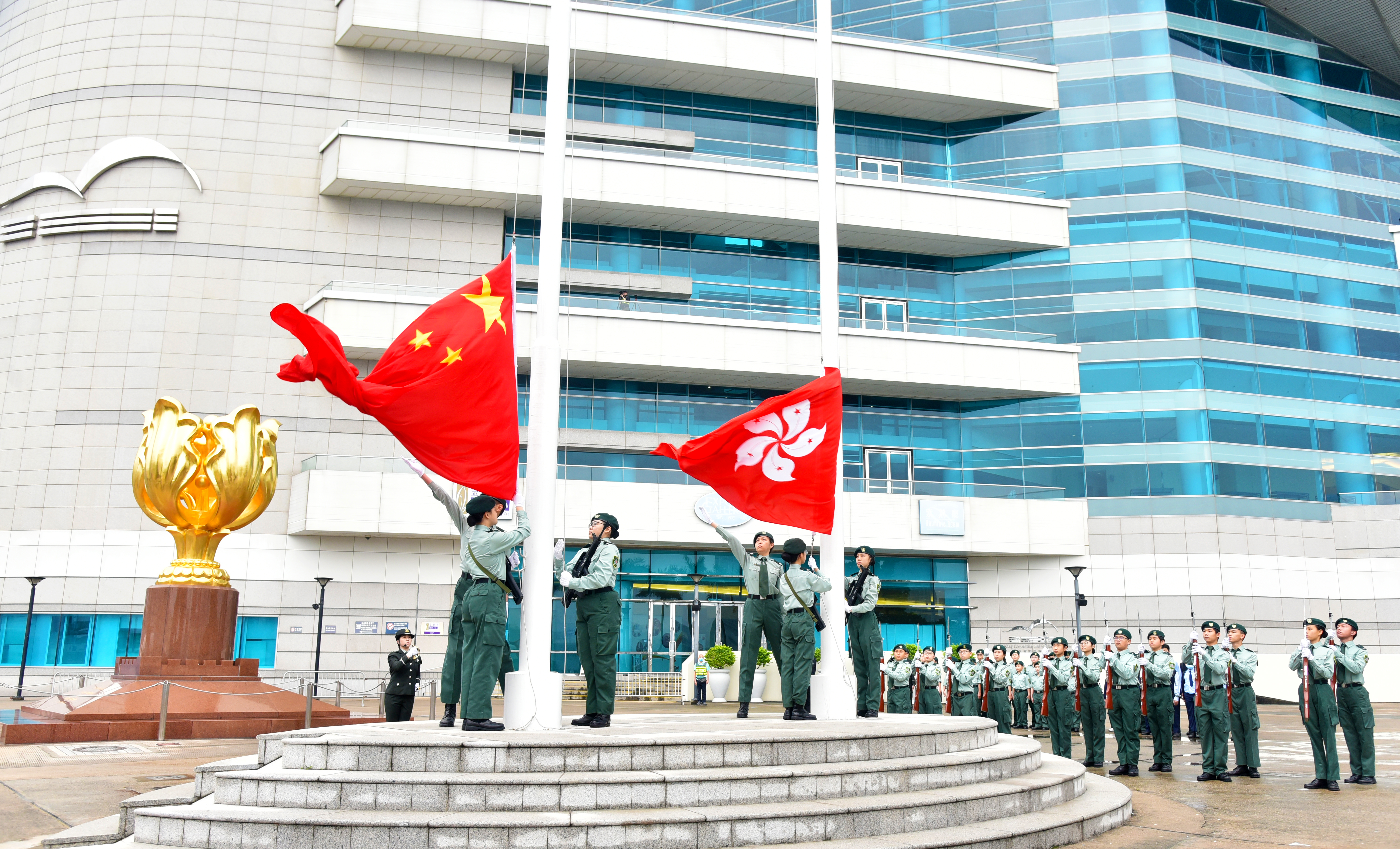 香港青少年軍國旗護衛隊先以正步形式經過觀禮嘉賓並到達旗台就位,伴隨着國歌奏起,全場觀眾肅立高唱國歌,升旗手將國旗及區旗升起;完成升旗儀式後,香港青少年軍國旗護衛隊隨着會歌《嘹亮》,邁着整齊的步伐自信離場,在場人士無一不受現場的氣氛觸動。
