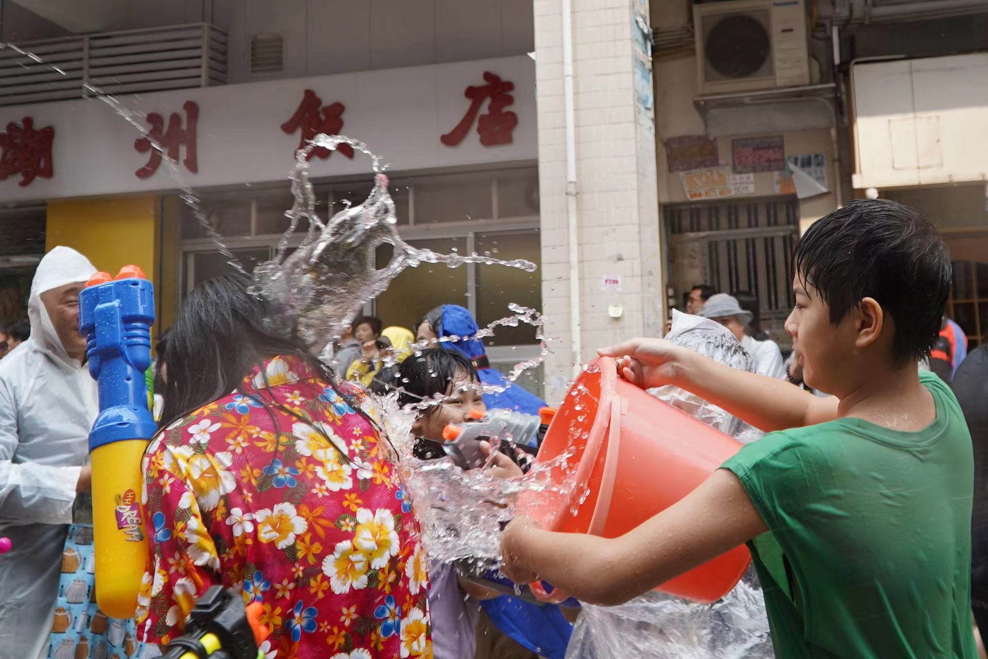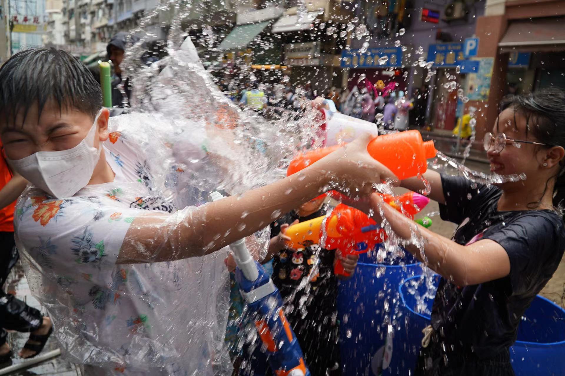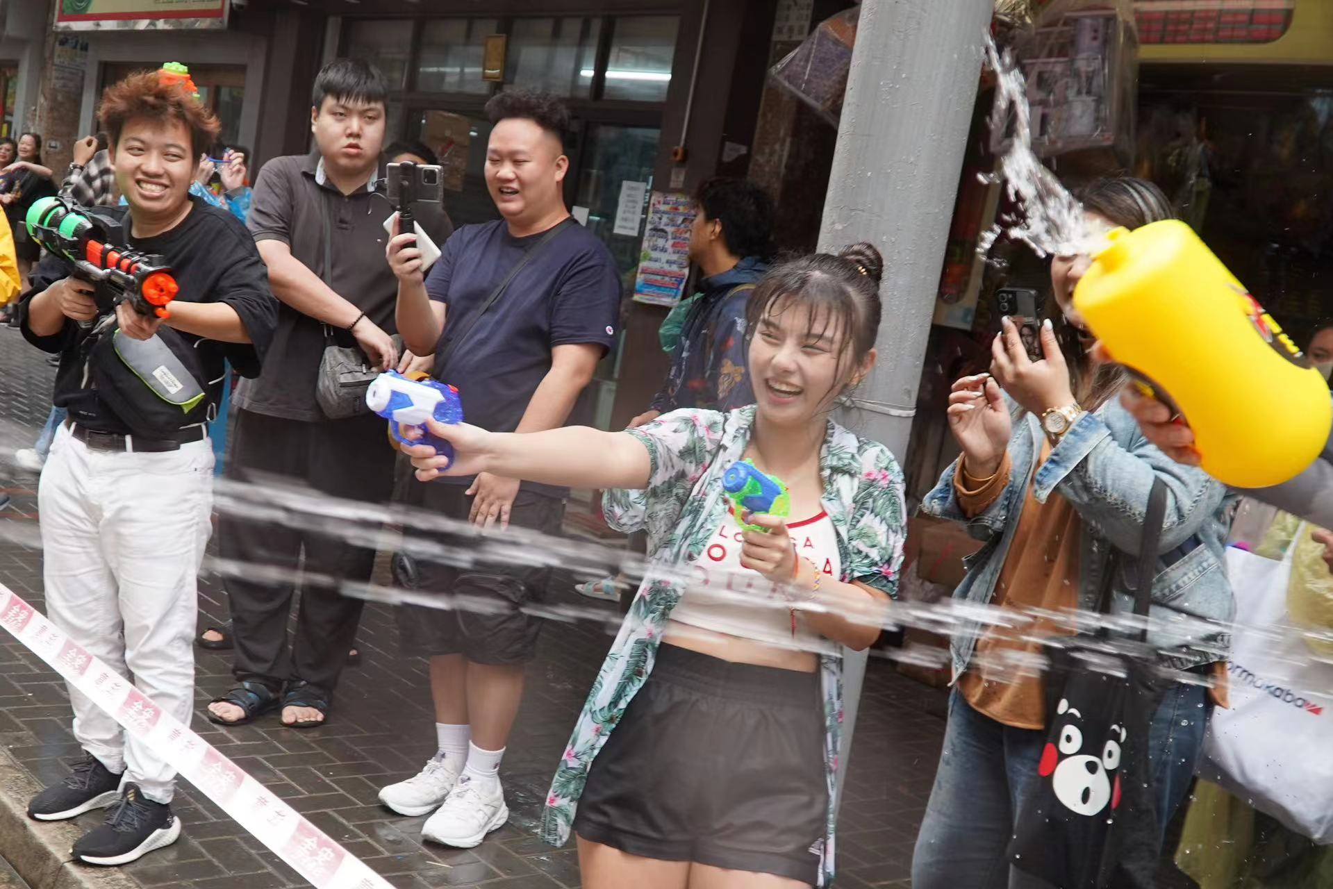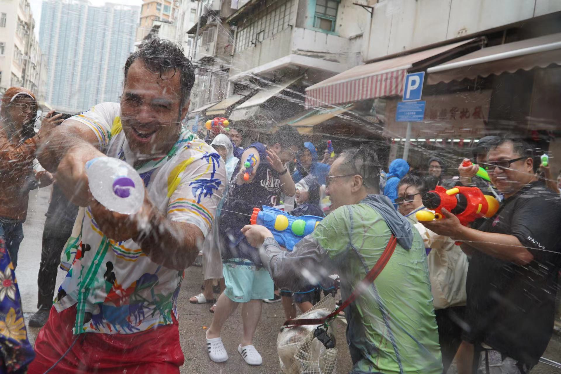 大公文匯全媒體報道,因疫情停辦逾3年的九龍城潑水節復辦,主辦單位今日(9日)在賈炳達道公園舉辦「龍城HAPPY潑水嘉年華」,設有20多個攤位,提供泰式按摩、泰菜、泰拳表演、手繪等20多項體驗活動予市民參與。另外,熱鬧好玩的潑水活動就在城南道舉行,數百市民參與,不少人手持水槍展開激烈的潑水大戰。不少市民身穿泰國風花襯衫,面上塗抹白粉,盡情體驗地道泰式文化。小朋友更是玩得不亦樂乎,興奮地互相潑水,場面歡樂。