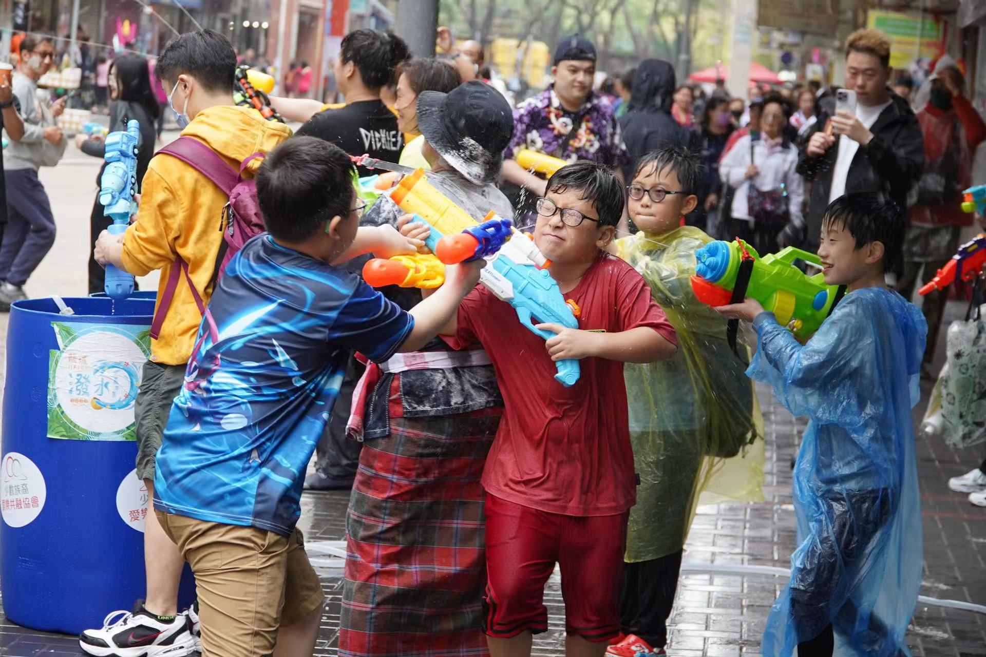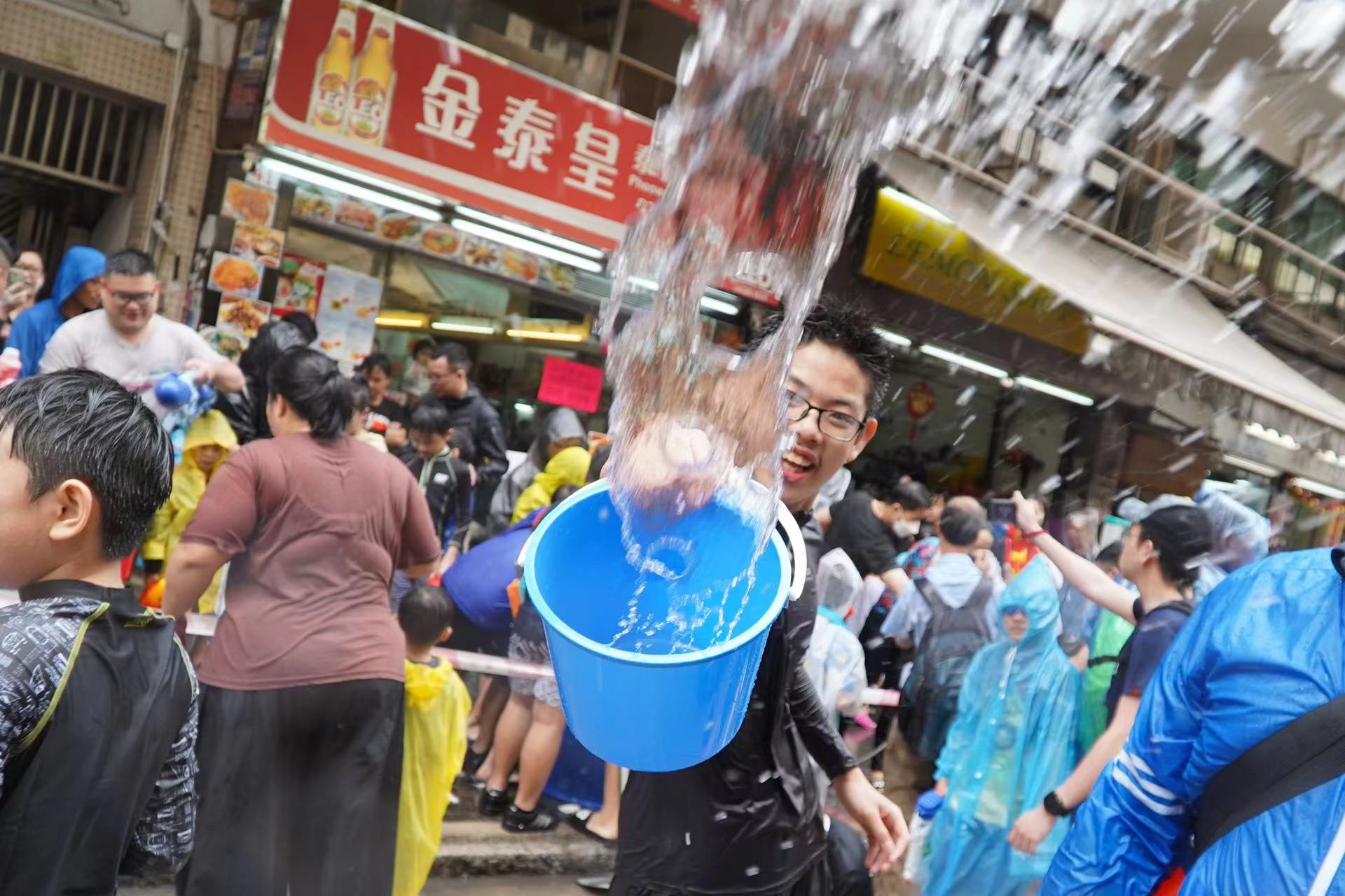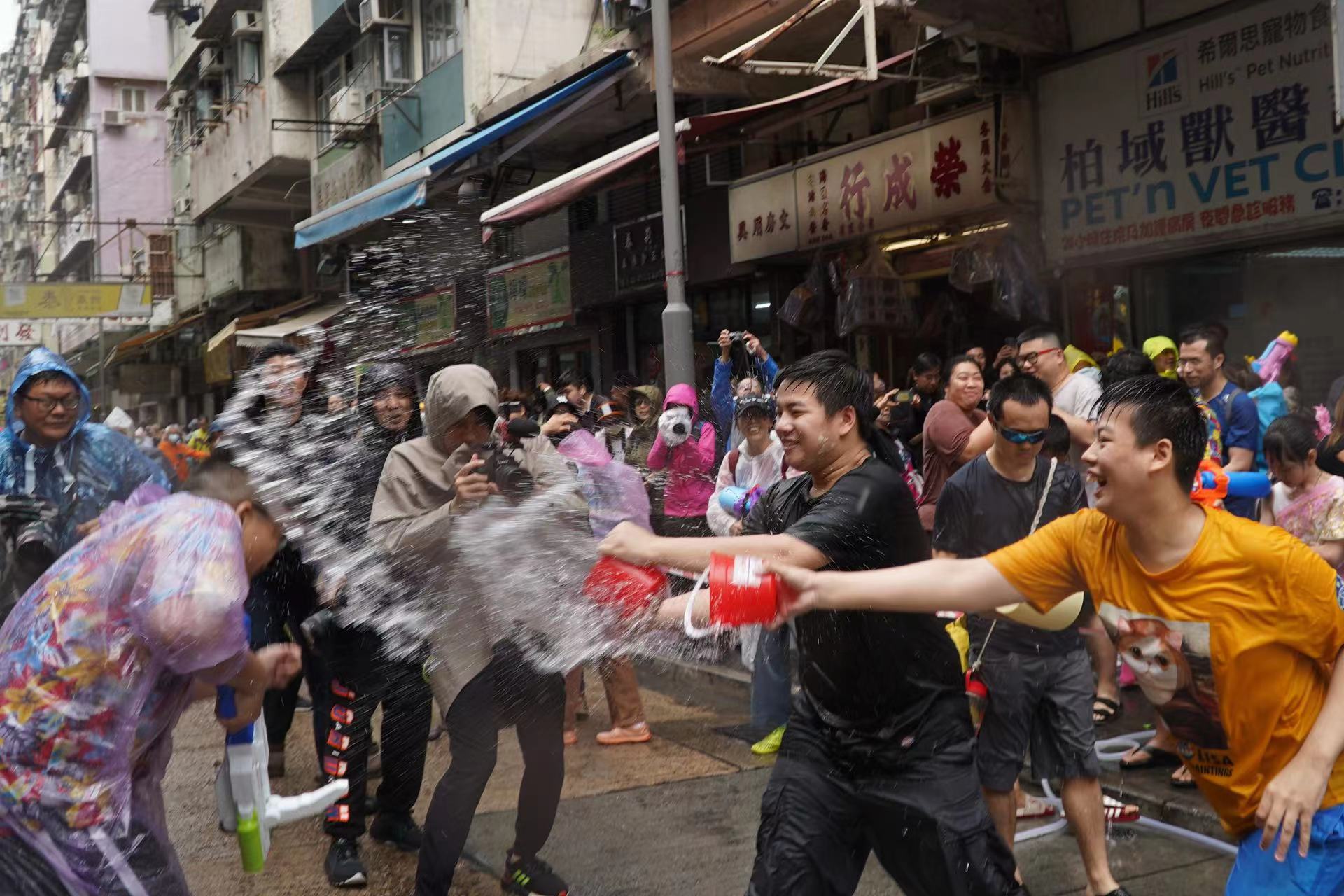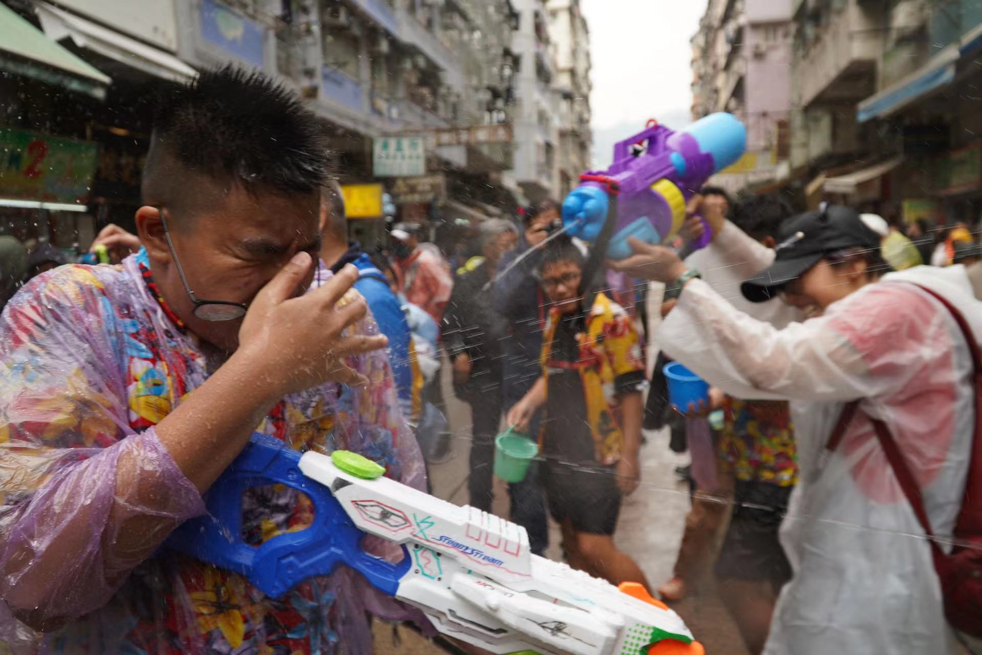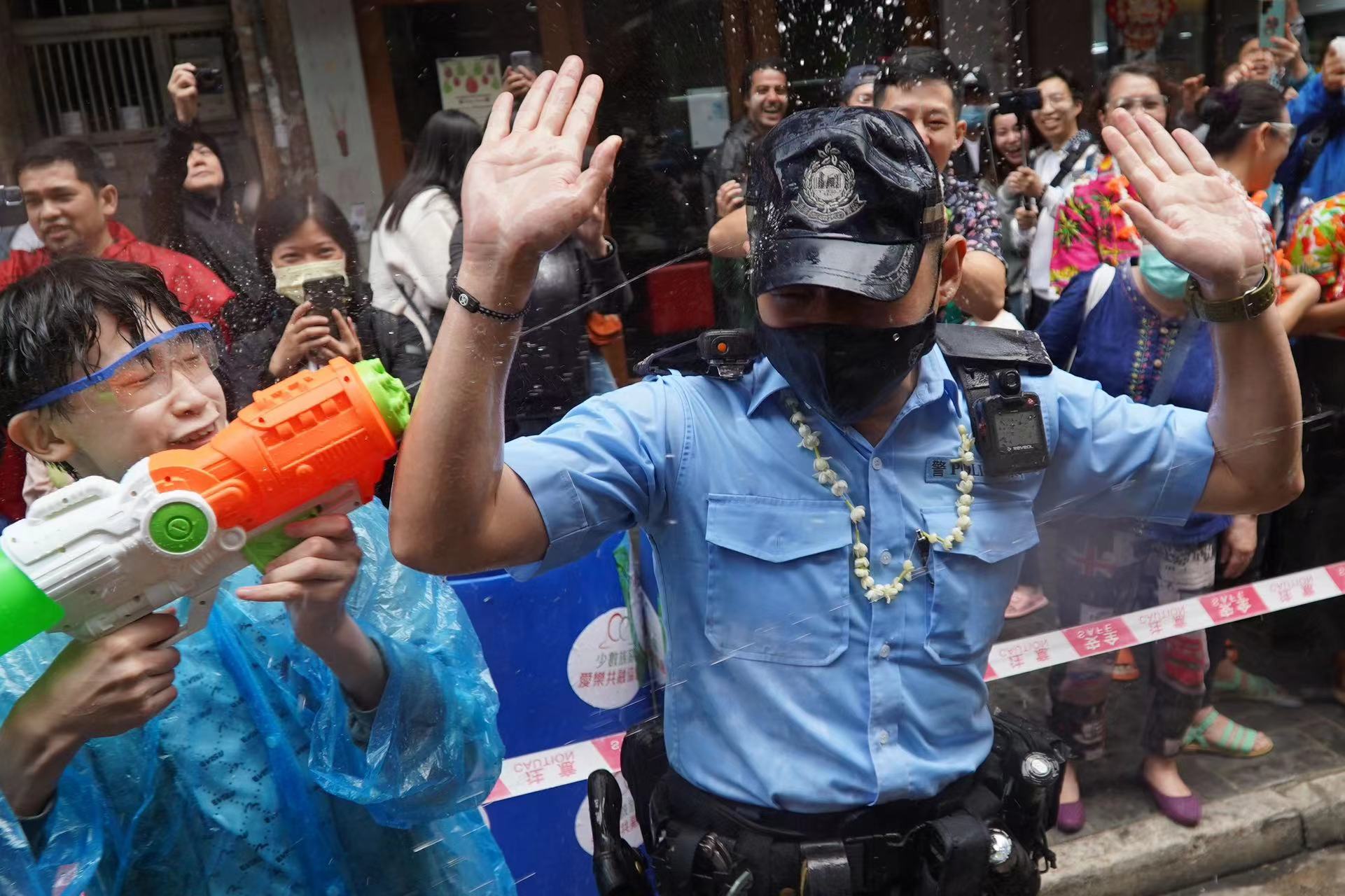 大公文匯全媒體報道,因疫情停辦逾3年的九龍城潑水節復辦,主辦單位今日(9日)在賈炳達道公園舉辦「龍城HAPPY潑水嘉年華」,設有20多個攤位,提供泰式按摩、泰菜、泰拳表演、手繪等20多項體驗活動予市民參與。另外,熱鬧好玩的潑水活動就在城南道舉行,數百市民參與,不少人手持水槍展開激烈的潑水大戰。不少市民身穿泰國風花襯衫,面上塗抹白粉,盡情體驗地道泰式文化。小朋友更是玩得不亦樂乎,興奮地互相潑水,場面歡樂。