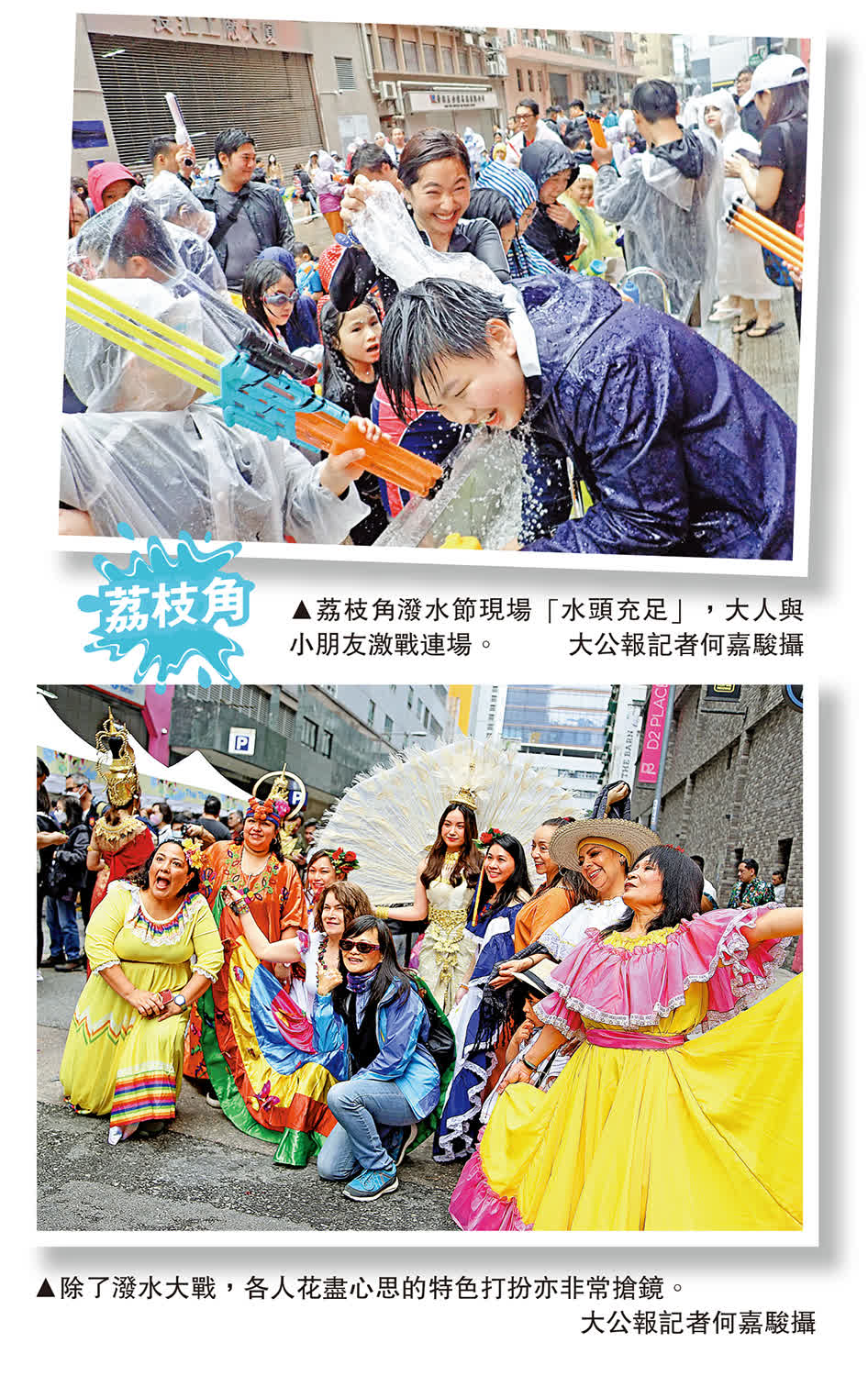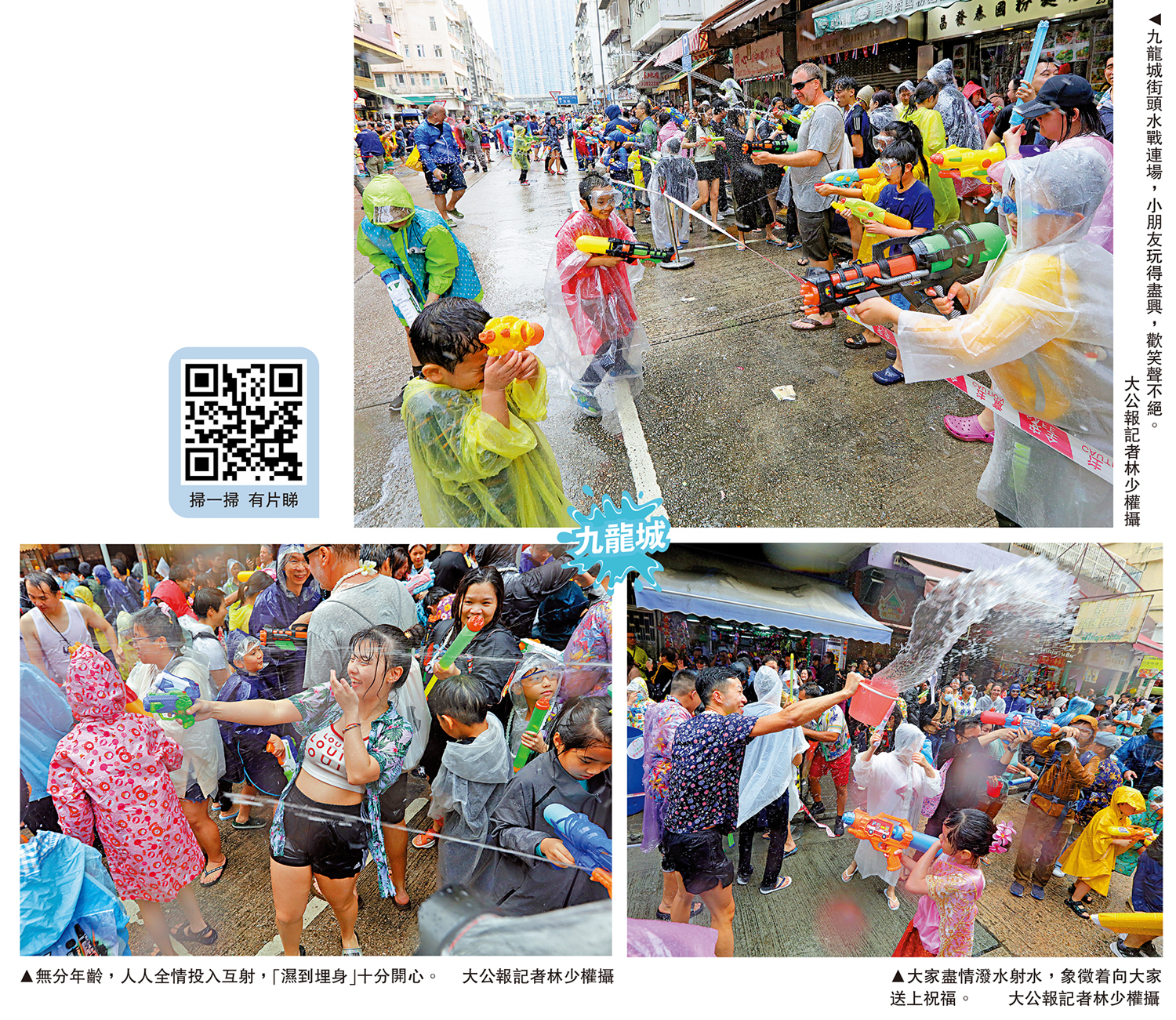 (大公報 記者 易曉彤)闊別三年的香港潑水節,在疫後復常首次復辦。九龍城和荔枝角昨日分別有潑水節慶祝活動,吸引大批市民參加,場面熱鬧。在九龍城城南道街頭,大人與小朋友齊齊參與「街頭水戰」,在潑水區內不論男女老幼,甚至協助維持秩序的警員都會成為被潑水祝福的對象,樂也融融。