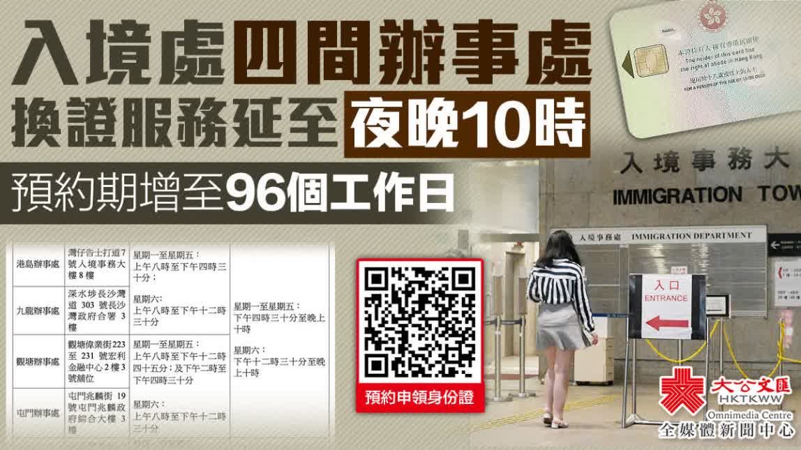 大公文匯全媒體報道,入境事務處(入境處)今日(10日)宣布,將於4月12日起推出兩項優化預約身份證申請的安排: