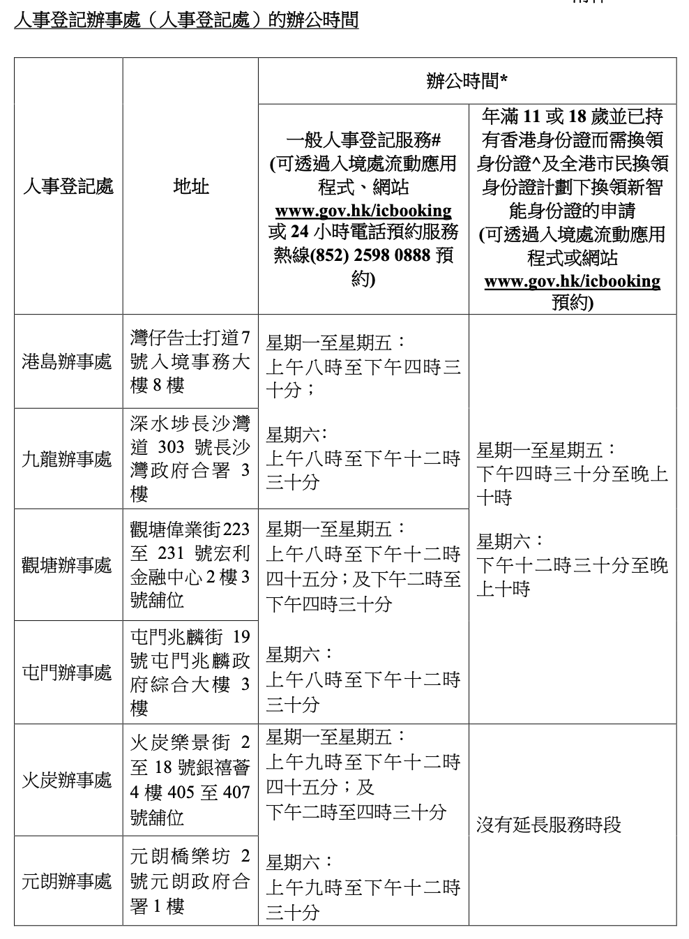 自2023年3月6日起,四間指定人事登記處(即港島辦事處、九龍辦事處、觀塘辦事處及屯門辦事處)延長服務時間至晚上10時,以在延長服務時段,即星期一至五下午4時30分到晚上10時,以及星期六下午12時30分到晚上10時,繼續有序地處理在「全港市民換領身份證計劃」結束後仍未換領新智能身份證的申請。