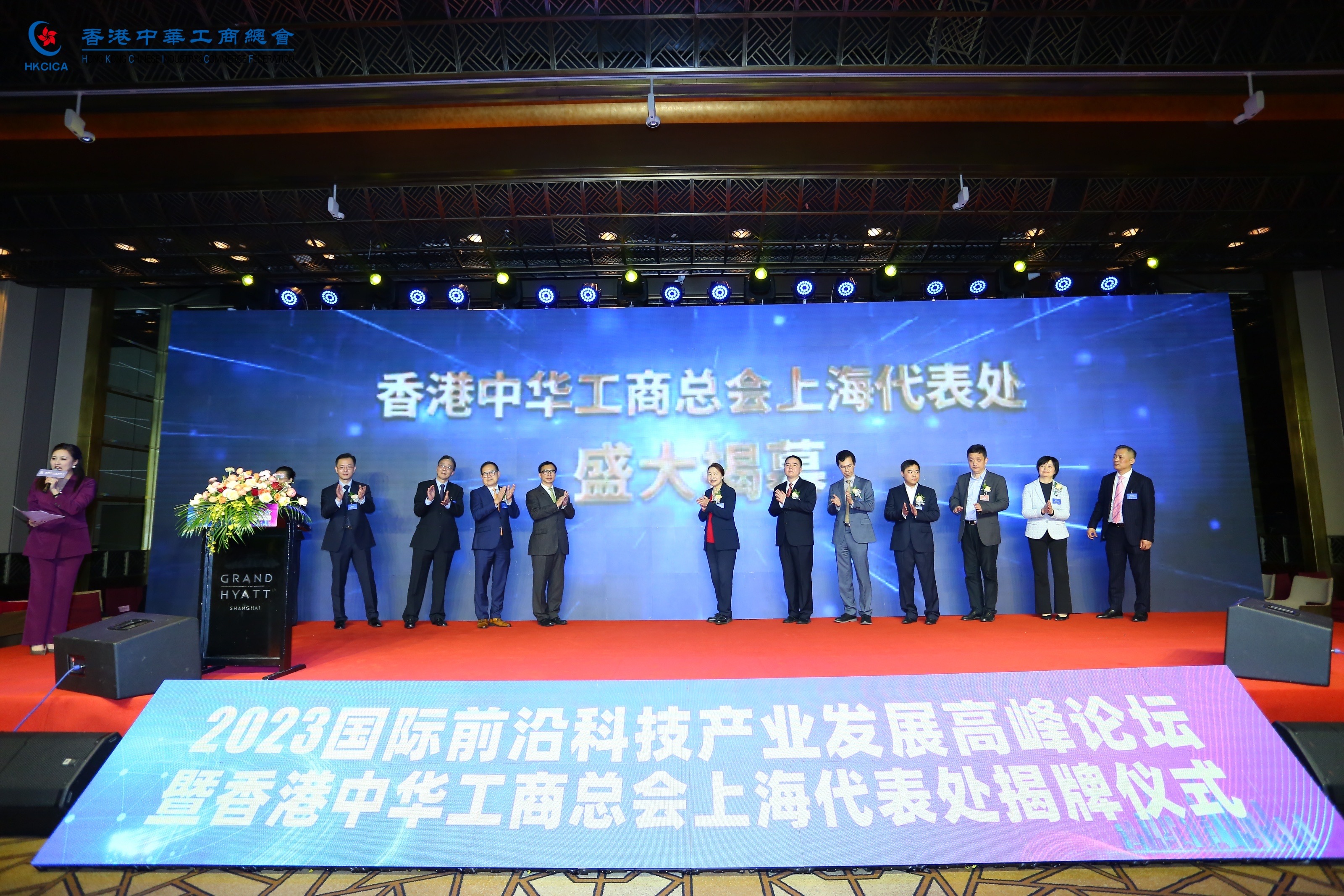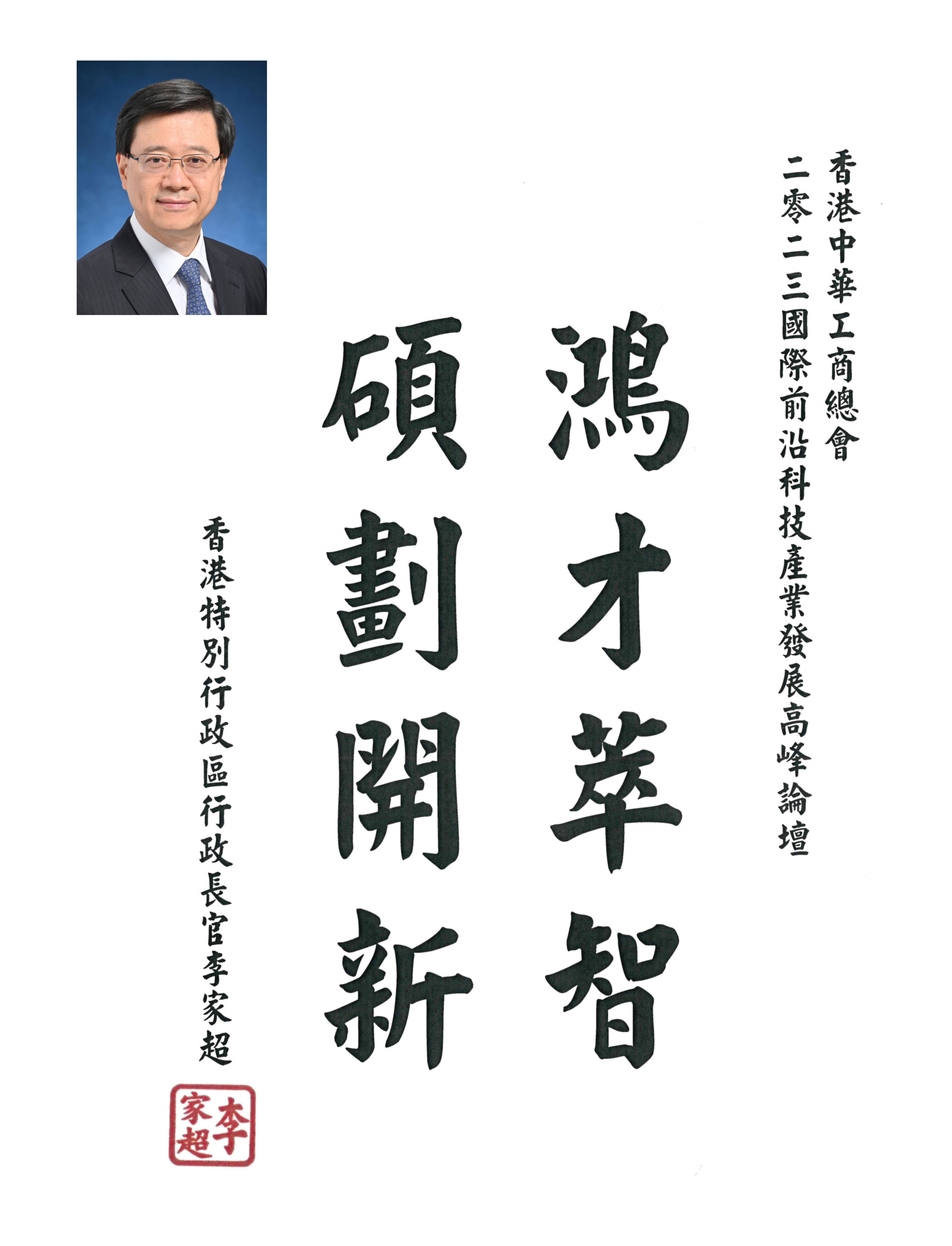 (大公文匯網記者 張帆)由香港中華工商總會主辦的2023國際前沿科技產業發展高峰論壇周末在上海舉行。行政長官李家超發來題詞「鴻才萃智,碩劃開新」。論壇現場還舉行了香港中華工商總會上海代表處揭牌儀式。