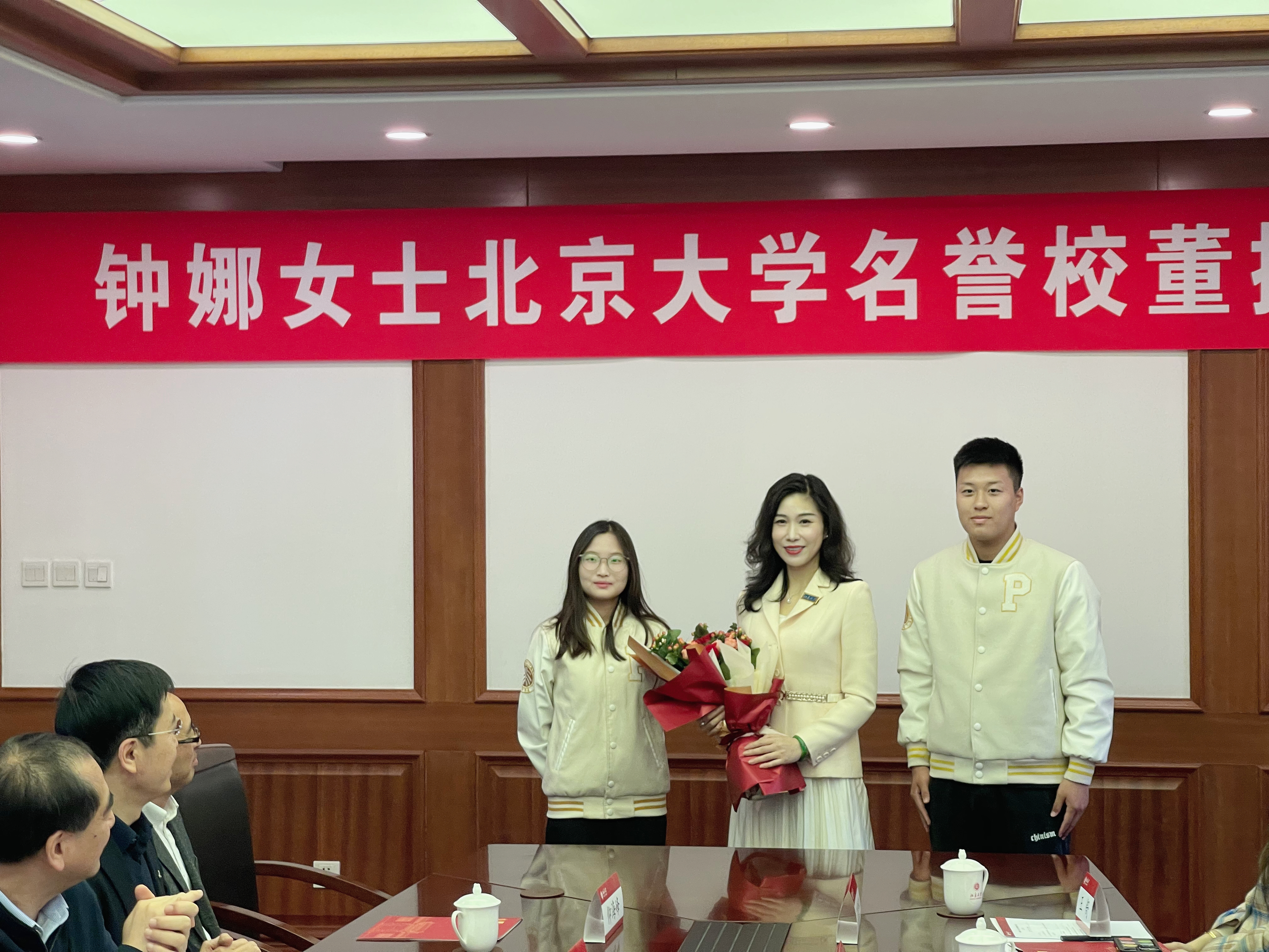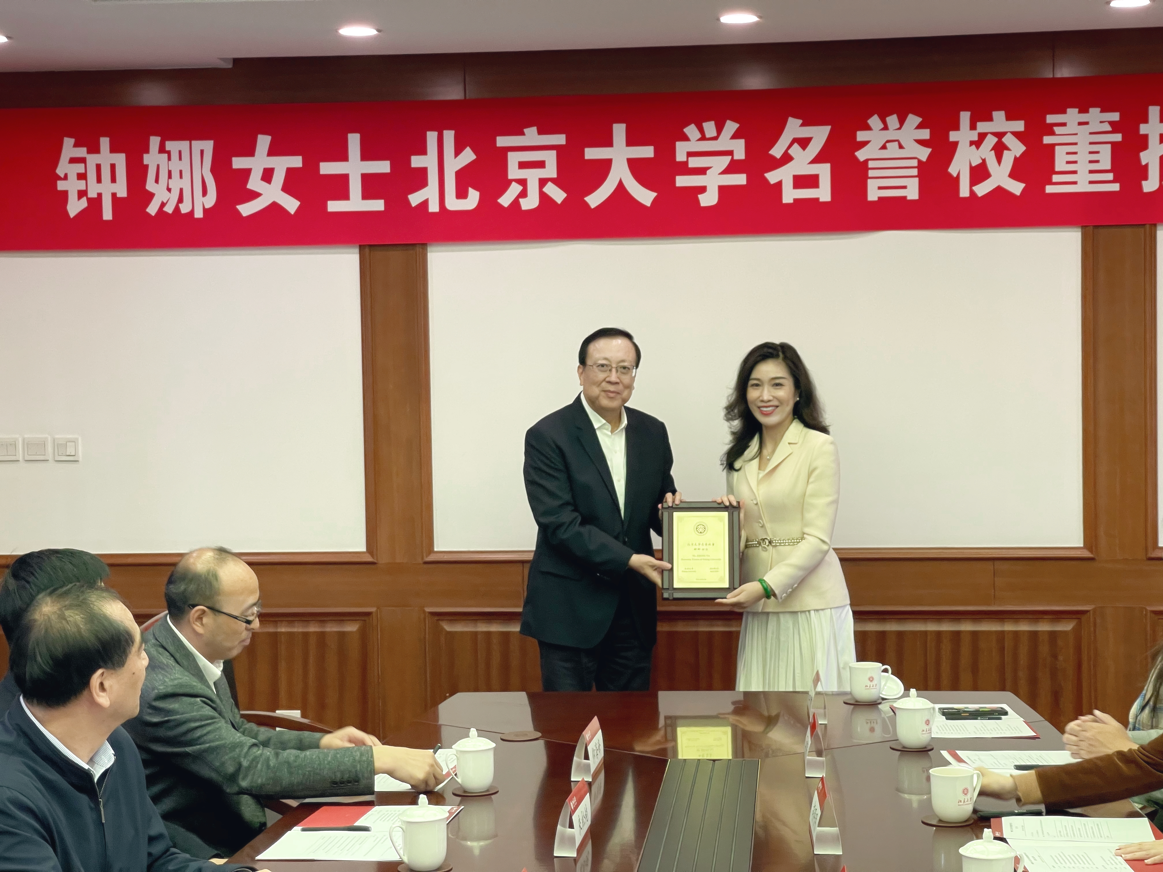 在北京大學臨湖軒舉行的授予儀式現場,北大黨委書記、教育基金會理事長郝平向鍾娜頒授名譽校董銅牌,校長龔旗煌向香港圓中集團有限公司董事長袁福林致贈感謝狀。學生代表為鍾娜校董佩戴北京大學校徽並獻花。