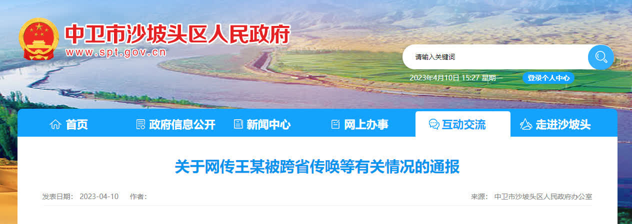 今日(4月10日),針對網上關於「寧夏籍居民王芳於3月23日在河北省邢台市清河縣被3名不明身份男子抓捕」的信息,寧夏中衛市沙坡頭區人民政府網站發布通報: