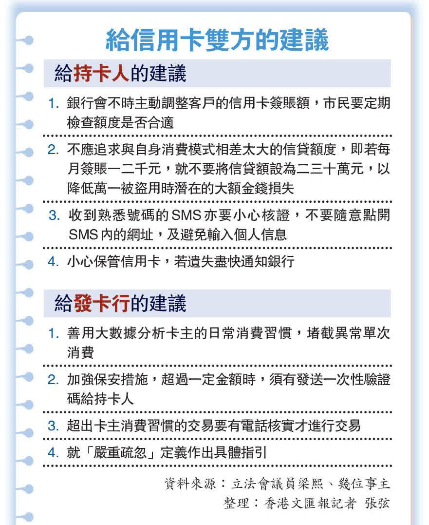 梁熙提到,銀行會不時主動調整用戶的信用卡額度,因此市民要不時檢查自己的信用卡額度,不應追求與自身消費模式相差太大的信貸額度,以減低萬一被盜用時潛在的大額金錢損失。同時,金管局應發放準則,加強對信用卡用戶的保障或保安措施。
