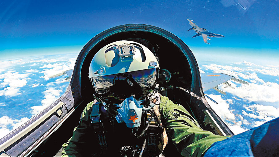 正在台島以東巡弋待戰的海軍山東艦航母編隊與前出的戰區海空力量密切協同,組織區域制空、對海突擊、支援策應等課目演練。編隊各屬艦展開海上布勢,執行區域防空、防潛反潛等任務。殲-15艦載機輪番升空,在演習海域迅速構建起航母編隊作戰體系。