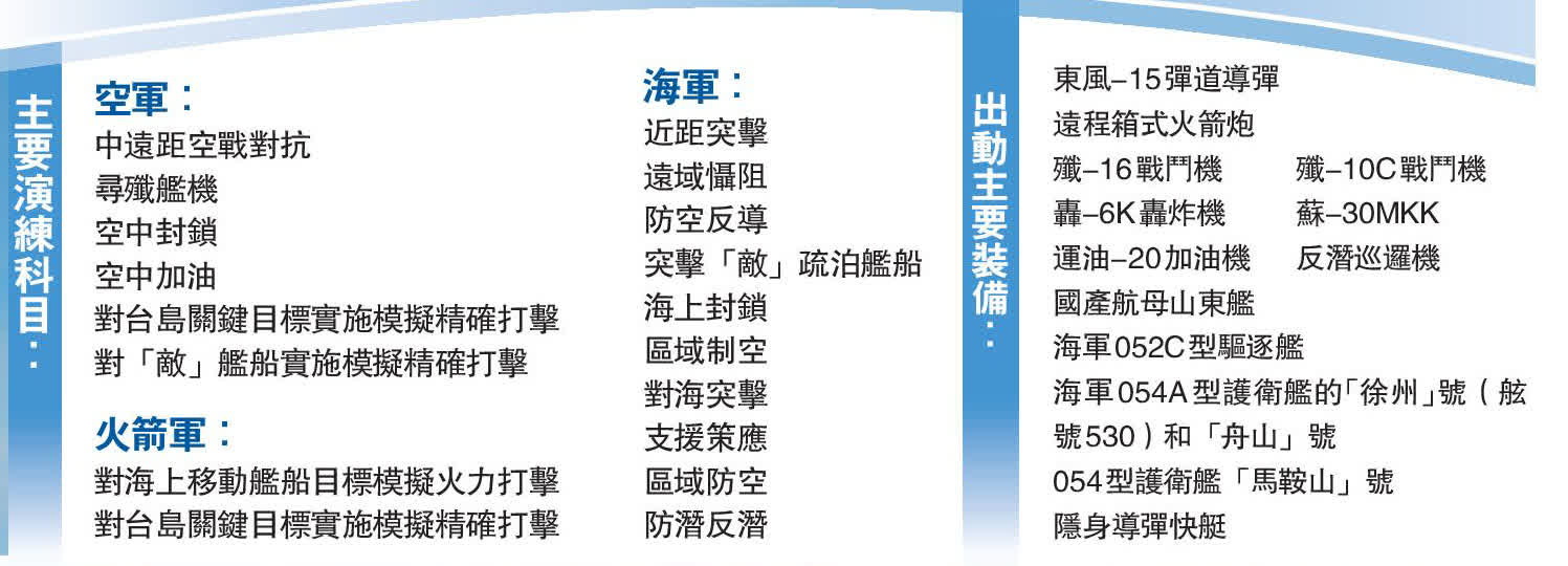 戰區海軍多艘執行戰巡進逼任務的驅護艦針對性展開突擊「敵」疏泊艦船、海上封鎖等行動演練。在台灣海峽,台島西北、西南以及台島以東海域主動出擊,發揮性能優勢,靈活搶佔有利陣位,高速進逼壓制對手。已抵近台島花蓮外海的徐州艦編隊,聯合岸導突擊群構建岸海一體打擊體系,某岸導團按時機動到指定地域,快速完成發射準備,對「敵」海上目標實施模擬打擊。