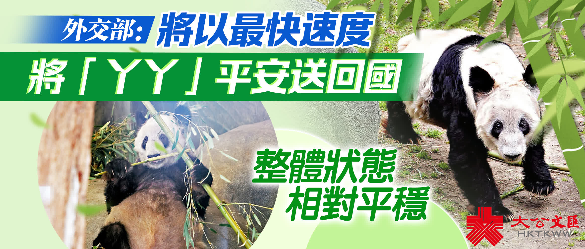 外交部發言人汪文斌說,經向主管部門了解,按照中國動物園協會和美國孟菲斯動物園之間達成的大熊貓合作研究協議,雙方合作於今年4月7日到期,美國孟菲斯動物園已於4月8日舉行了歡送儀式。下一步美國魚類和野生動物管理局在4月12日結束大熊貓「丫丫」和「樂樂」出口許可證的公示之後,將按程序研究發放出口許可證,中方現已做好接返大熊貓「丫丫」回國的各項準備,並將與美方合作機構加強協調,完成運輸前的健康評估。在許可證發放後,將以最快速度將大熊貓「丫丫」平安運送回國。