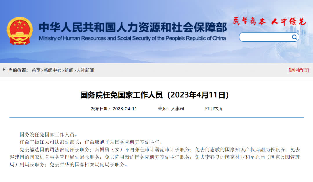 免去熊選國的司法部副部長職務;秦博勇(女)不再兼任審計署副審計長職務;免去何志敏的國家知識產權局副局長職務;免去趙建國的國家機關事務管理局副局長職務;免去陳祖新的國務院研究室副主任職務;免去李春良的國家林業和草原局(國家公園管理局)副局長職務;免去付華的國家檔案局副局長職務。