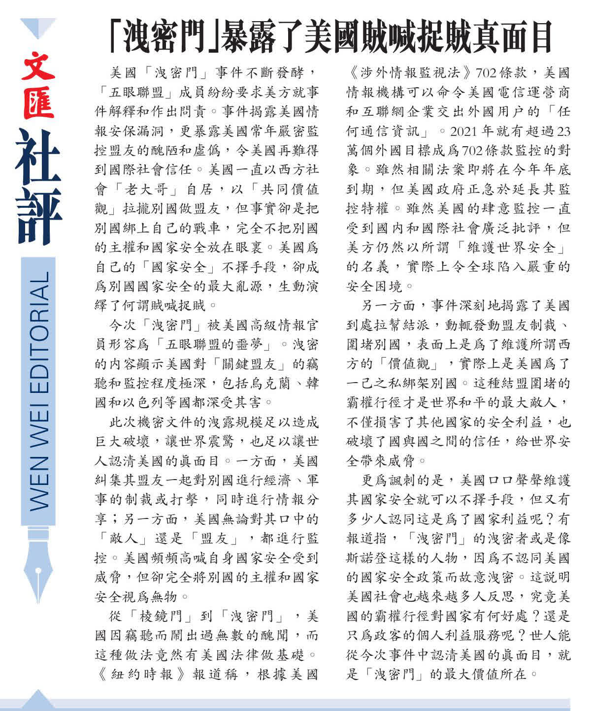 美國「洩密門」事件不斷發酵,「五眼聯盟」成員紛紛要求美方就事件解釋和作出問責。事件揭露美國情報安保漏洞,更暴露美國常年嚴密監控盟友的醜陋和虛偽,令美國再難得到國際社會信任。美國一直以西方社會「老大哥」自居,以「共同價值觀」拉攏別國做盟友,但事實卻是把別國綁上自己的戰車,完全不把別國的主權和國家安全放在眼裏。美國為自己的「國家安全」不擇手段,卻成為別國國家安全的最大亂源,生動演繹了何謂賊喊捉賊。