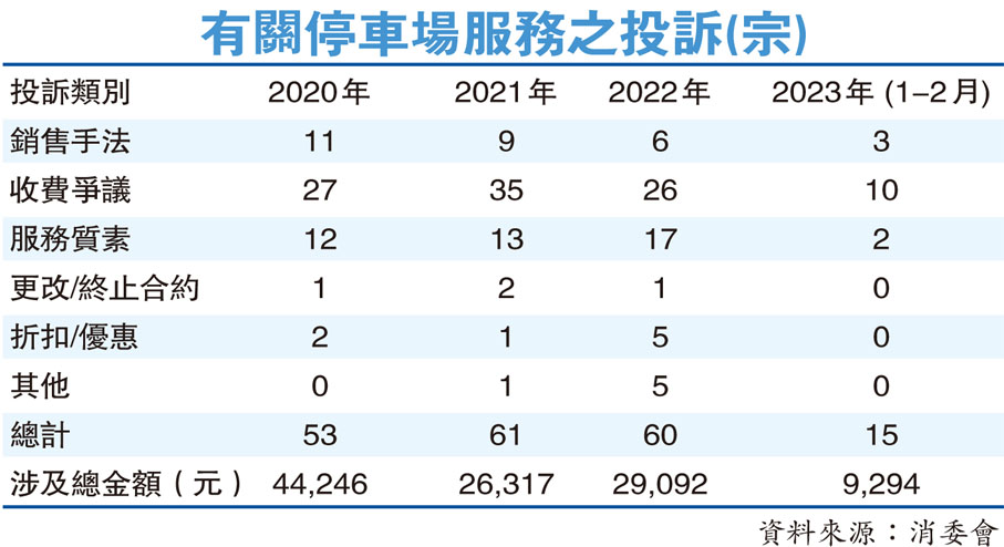 消委會平均每年接獲五六十宗有關停車場的投訴,今年首兩個月共有15宗,收費爭議佔最多,其次是銷售手法及服務質素。消委會在回覆香港文匯報查詢時表示,駕駛者一般不能長時間停留在停車場入口細看價錢牌,部分停車場入口亦沒有職員當值讓駕駛者查詢,因此停車場有責任在場外當眼處以直接及清晰的字眼標示不同日期及時段的收費。例如「全日泊」或「全日任泊」等字眼較為籠統,停車場有責任提供詳細的計算方法和所涵蓋的時段,讓消費者在清楚明白收費的情況下,決定是否光顧。