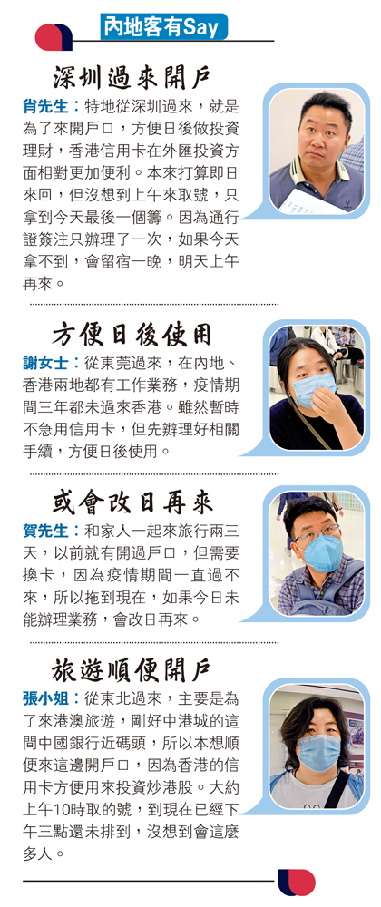 (大公報記者 邵穎)香港與內地全面恢復通關後,兩地往來更便利。香港作為國際金融中心,由內地來港的旅客除了吃喝玩樂,也有不少人跨境辦理金融事務,包括信用卡開戶等。