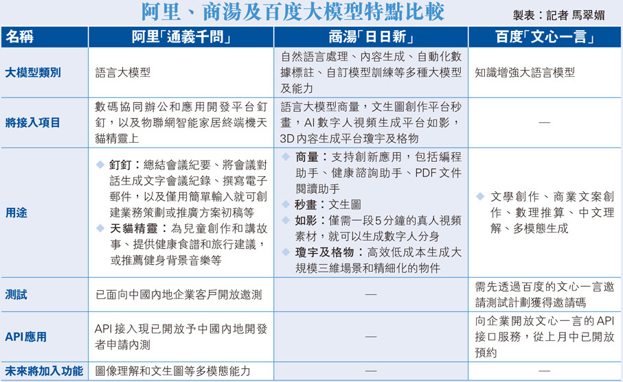 (香港文匯報 記者 馬翠媚)由ChatGPT引發的AI聊天機械人大戰愈演愈烈,繼百度(9888.HK)及商湯(0020.HK)先後推出「文心一言」及「日日新」大模型之後,阿里巴巴(9988.HK)旗下阿里雲最新亦推出「通義千問」,稱其能寫小說、寫代碼、寫食譜、寫詩,甚至做數學題等,集團更預告未來阿里巴巴所有產品如淘寶、天貓、餓了麼、高德地圖、優酷、盒馬等將接入「通義千問」,並將向所有企業開放。目前已開始邀請企業用戶測試體驗,用戶可通過官網申請,符合條件的用戶可參與體驗。