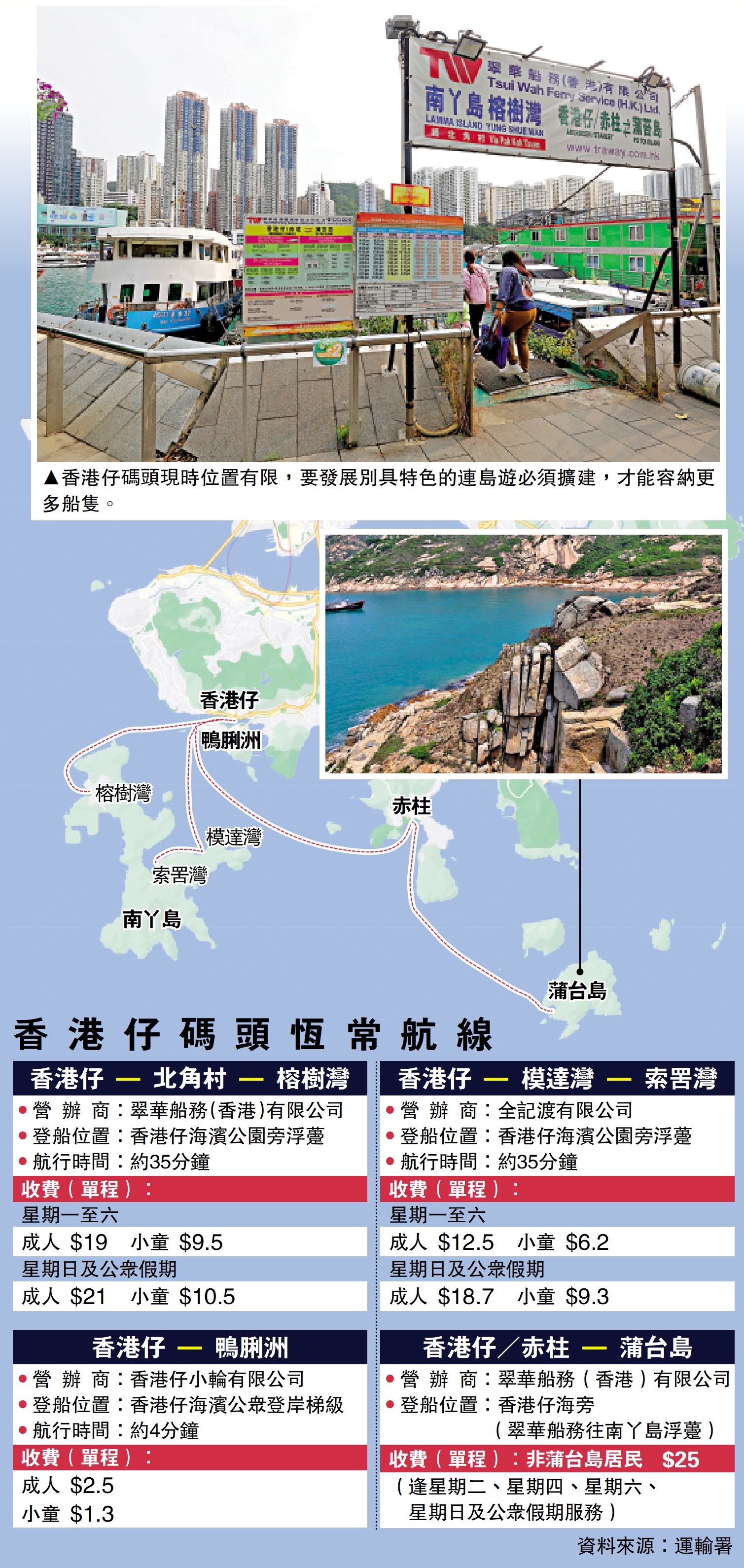 (大公報記者鍾怡、湯嘉平<文> 黃洋港、林少權<圖>)香港仔不僅有歷史悠久的漁村文化,亦有一定的地理優勢,與長洲、南丫島、蒲台島等離島距離均不遠。然而,鮮有外地遊客甚至本地市民知道香港仔碼頭有前往南丫島、蒲台島的渡輪。前幾年亦有船務營辦商開設由香港仔至長洲的航線,惟由於經營困難而取消。