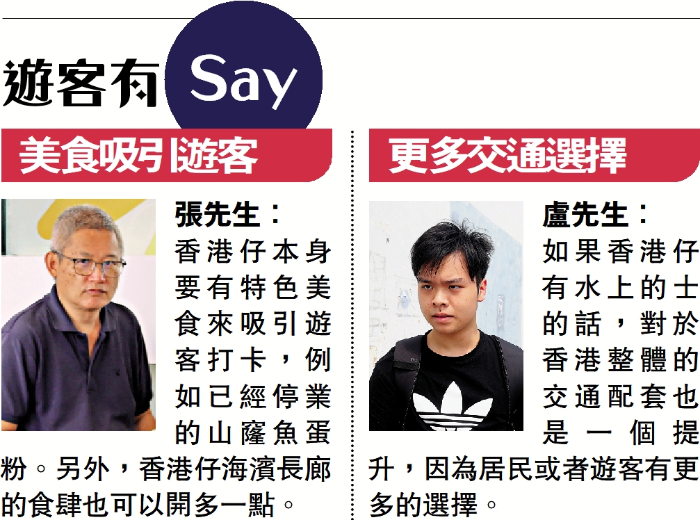胡先生建議應多加利用香港仔漁港優勢、鄰近旅遊景點、改善水上碼頭設施,並加強附近離島傳統文化及生態保育宣傳,相信會吸引更多遊客到南區觀光。