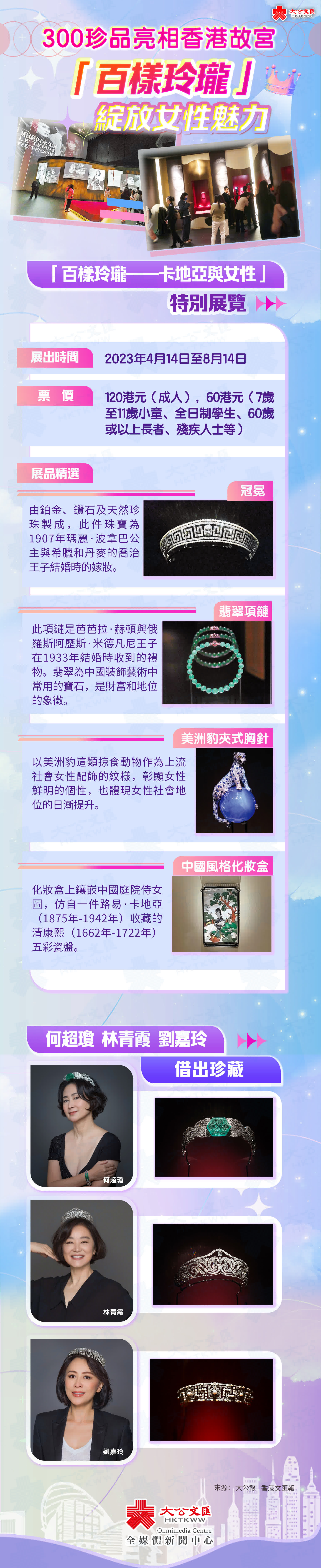 香港故宮文化博物館於昨日為全新特別展覽「百樣玲瓏—卡地亞與女性」揭幕。該展覽由香港故宮博物館策劃主辦,並由法國知名珠寶鐘錶品牌卡地亞(Cartier)支持,為全球首個以女性在卡地亞發展史上的獨特地位與影響為主題的特別展覽,共展出約300件卡地亞藝術珍品,包括從19世紀至今的珠寶、鐘錶、珍寶、配飾及文獻,展期為本周五(14日)至8月14日開放予公眾參觀。
