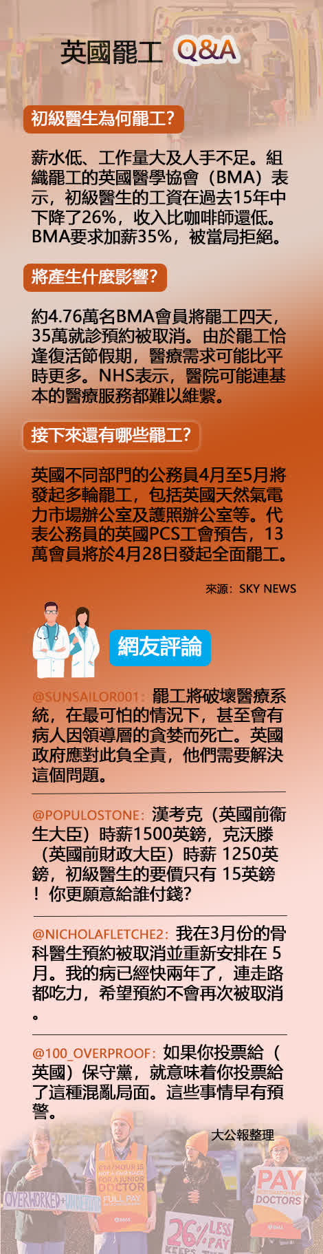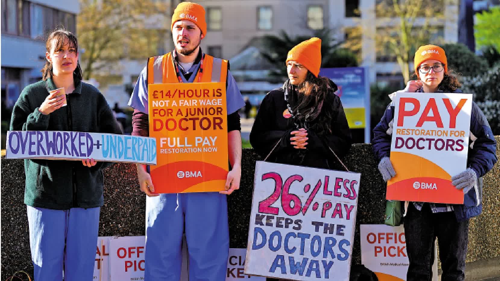 大公報綜合《衛報》、《每日郵報》報道:當地時間11日凌晨,英國各地的數萬名初級醫生開啟為期四天的罷工,要求加薪及增加人手。當局指罷工將帶來災難性影響,將有約35萬就診預約被取消,其中包括一些重要的手術,患者面臨巨大風險。